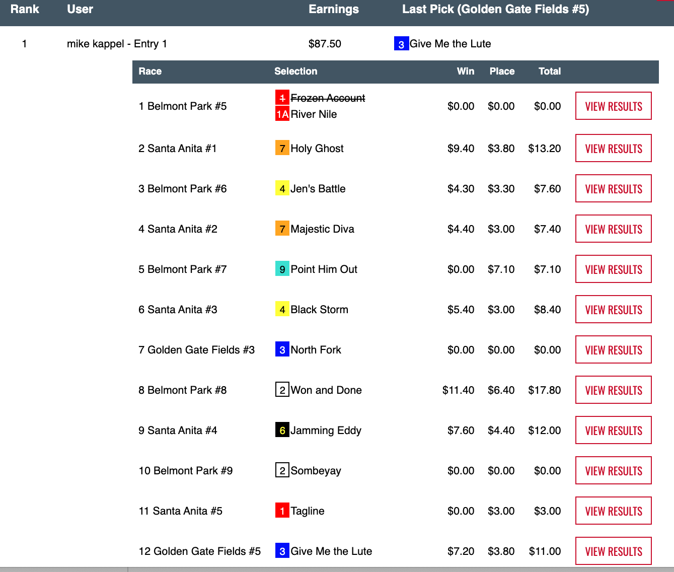 The result was a win in NHC qualifier at HorsePlayers and the high-score of the day. Karen Richards hit that 5-2 shot in the 5th at Golden Gate (Give Me the Lute) to get up for second and earn the other available berth. Here’s a look at Kappel’s Sunday splendor: