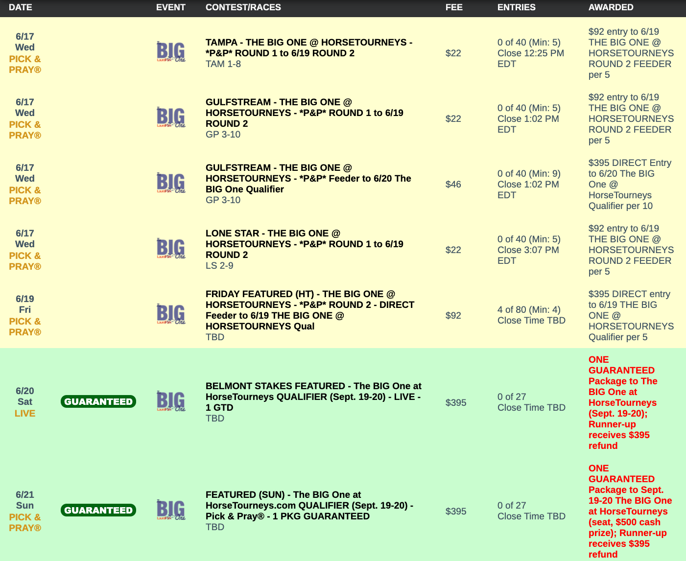 Entry fees for the weekend qualifiers remain at $395 each. One grand prize of an entry to The BIG One — and an immediate $500 credit to your HorseTourneys account (in lieu of what would have been a $500 travel credit to Laurel) — is guaranteed. The runner up in each qualifier receives a $395 entry refund.