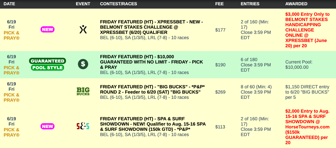 You can build up your Belmont Stakes bankroll in Friday’s $10,000 Guaranteed No Limit Pick & Pray. Entries are $190 apiece.