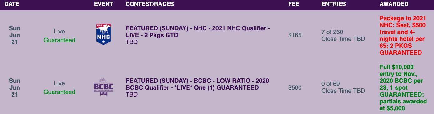 Again the NHC & BCBC share the stage at HorsePlayers with a pair of live-format tourneys on Sunday.