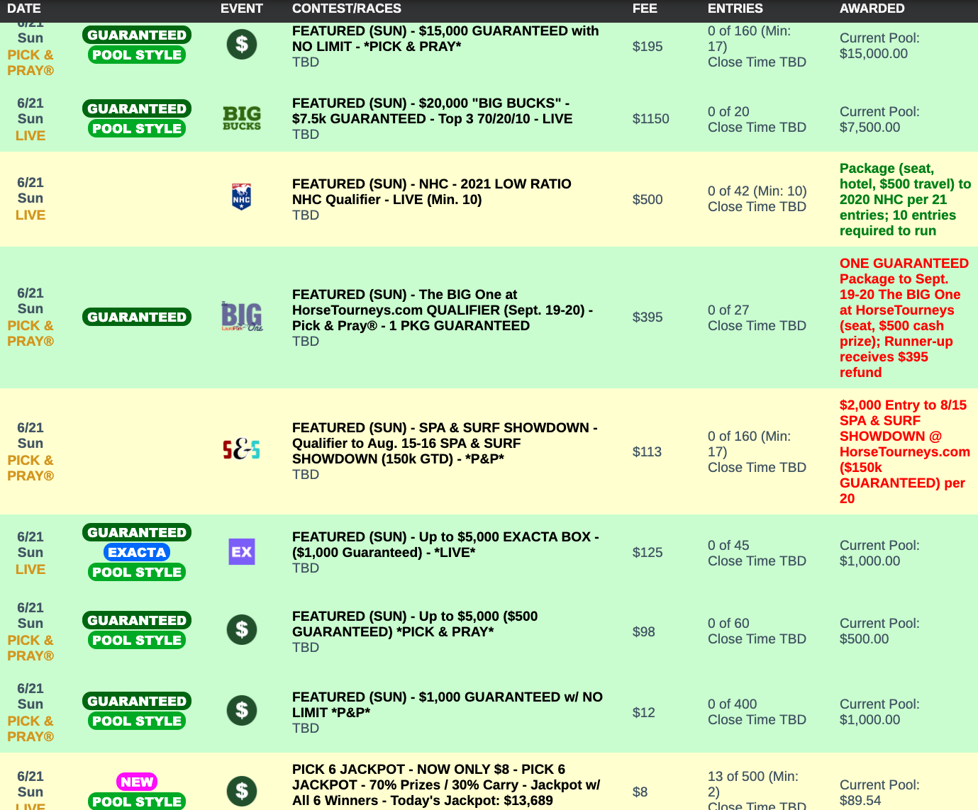 Sunday is no time for a Belmont Stakes hangover because another nine featured events are on tap—seven here at HorseTourneys and two at HorsePlayers.