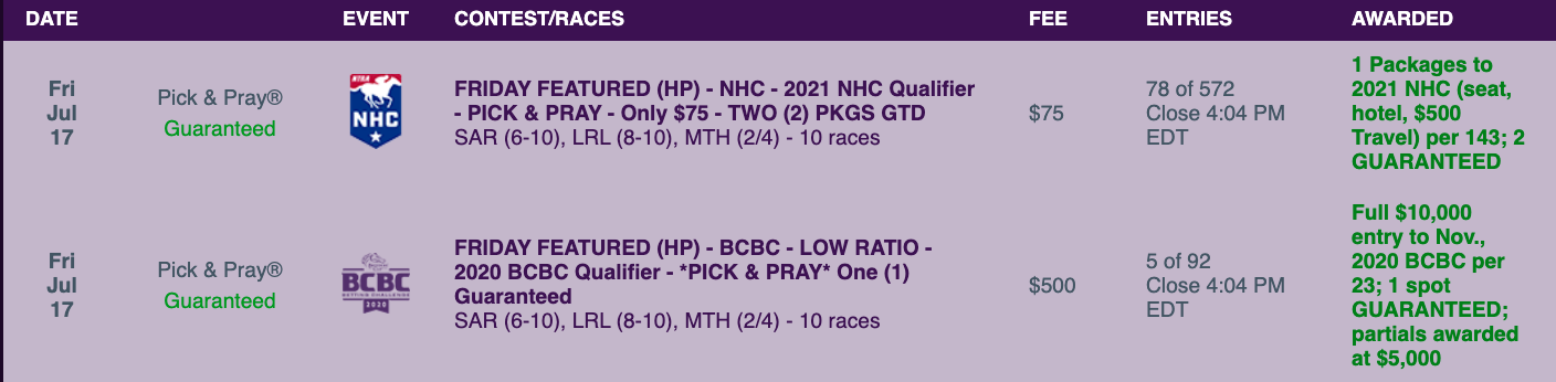 There’s also a qualifier a day this weekend for the August 15-16 Spa & Surf Showdown, whose guaranteed purse is up to $191,600, and that figure will grow with each successive qualifier. Winners garner a $2,000 entry to the all-cash competition here at HorseTourneys. The buy-in each day for these qualifiers is $113. Winners (1-per-20) will play two full days of racing from Saratoga and Del Mar (we hope!). Friday’s format is Pick & Pray.