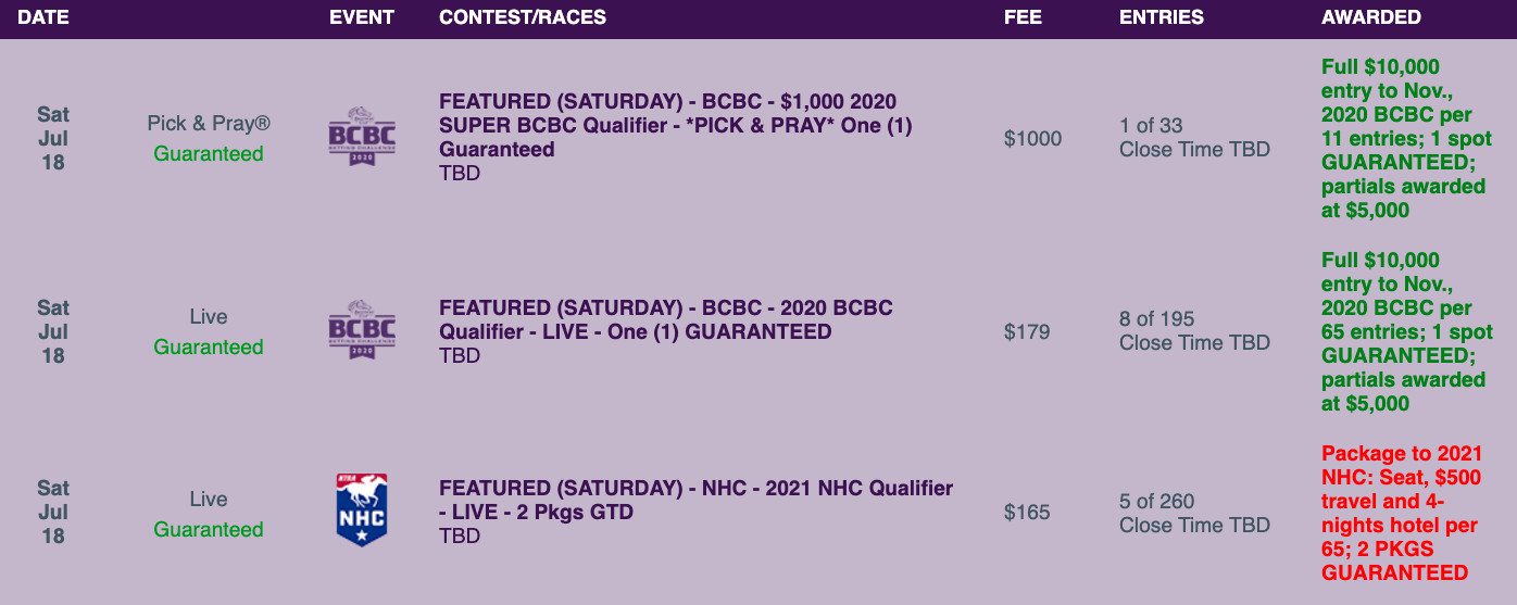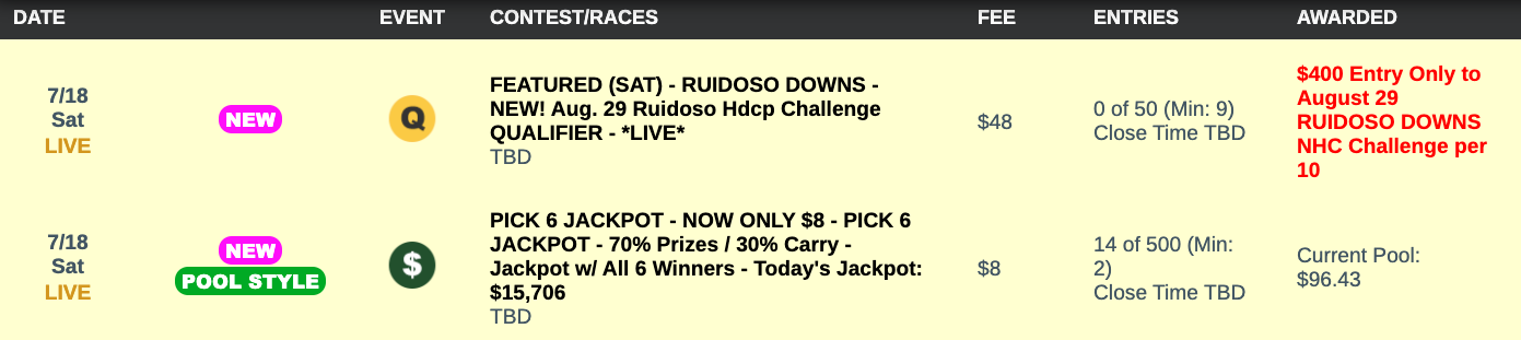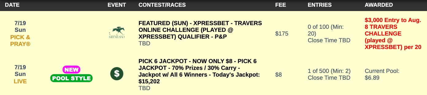 A brand-new qualifier is that for the August 8 Travers Challenge, which will be held over at Xpressbet. A $175 entry gets you a 1-per-20 at a $3,000 Travers Challenge entry in this 12-race Pick & Pray.