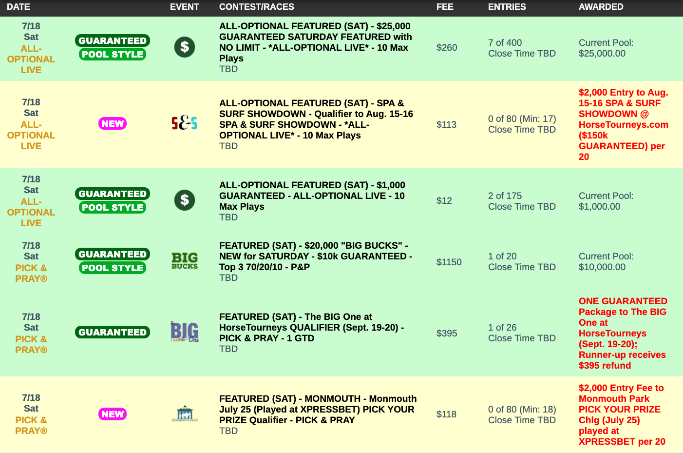 It’s a busy Saturday with the Haskell taking place at Monmouth, the Coaching Club American Oaks headlining the Saratoga card and eight featured events being offered here at HorseTourneys. Two of them will be run in the special All Optional Live format.