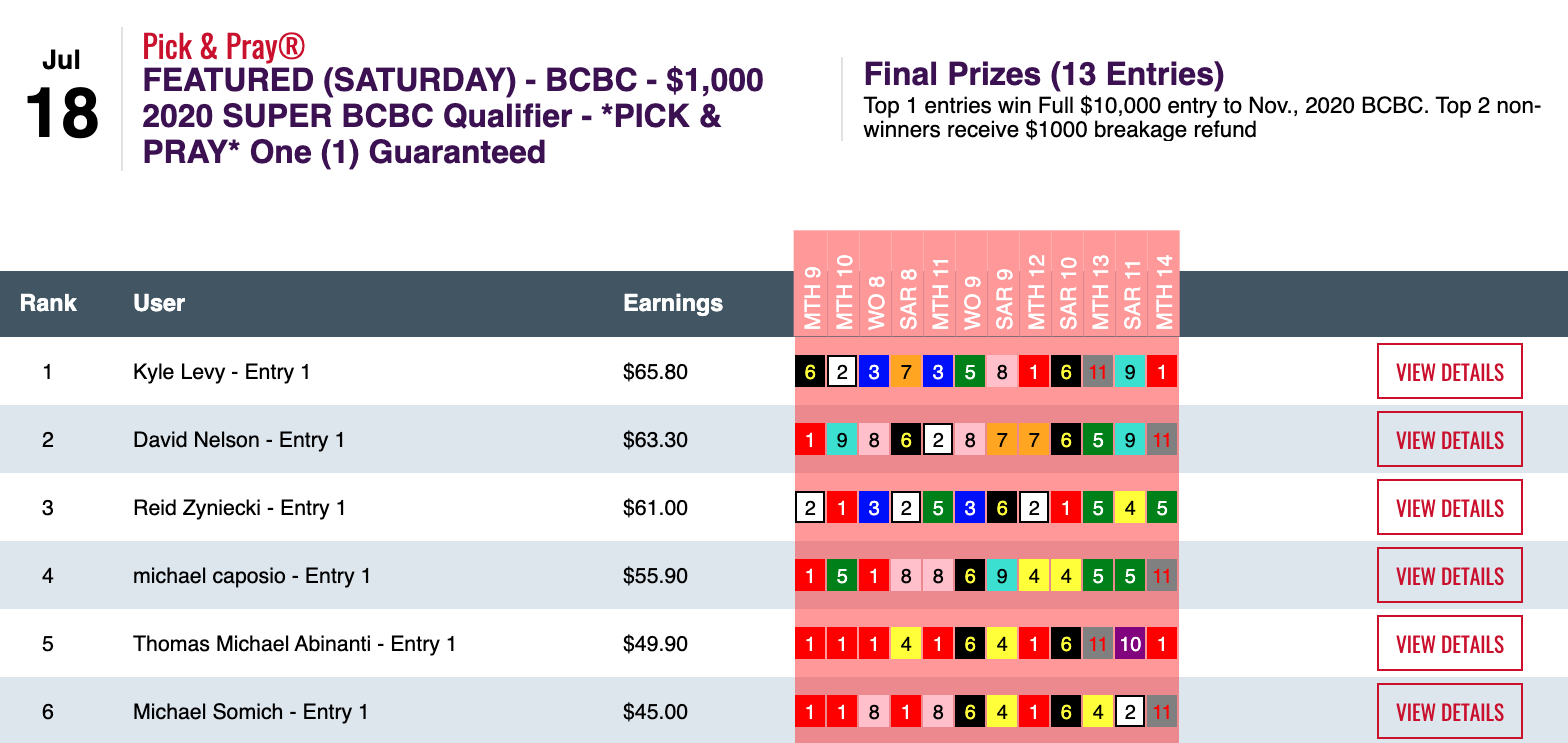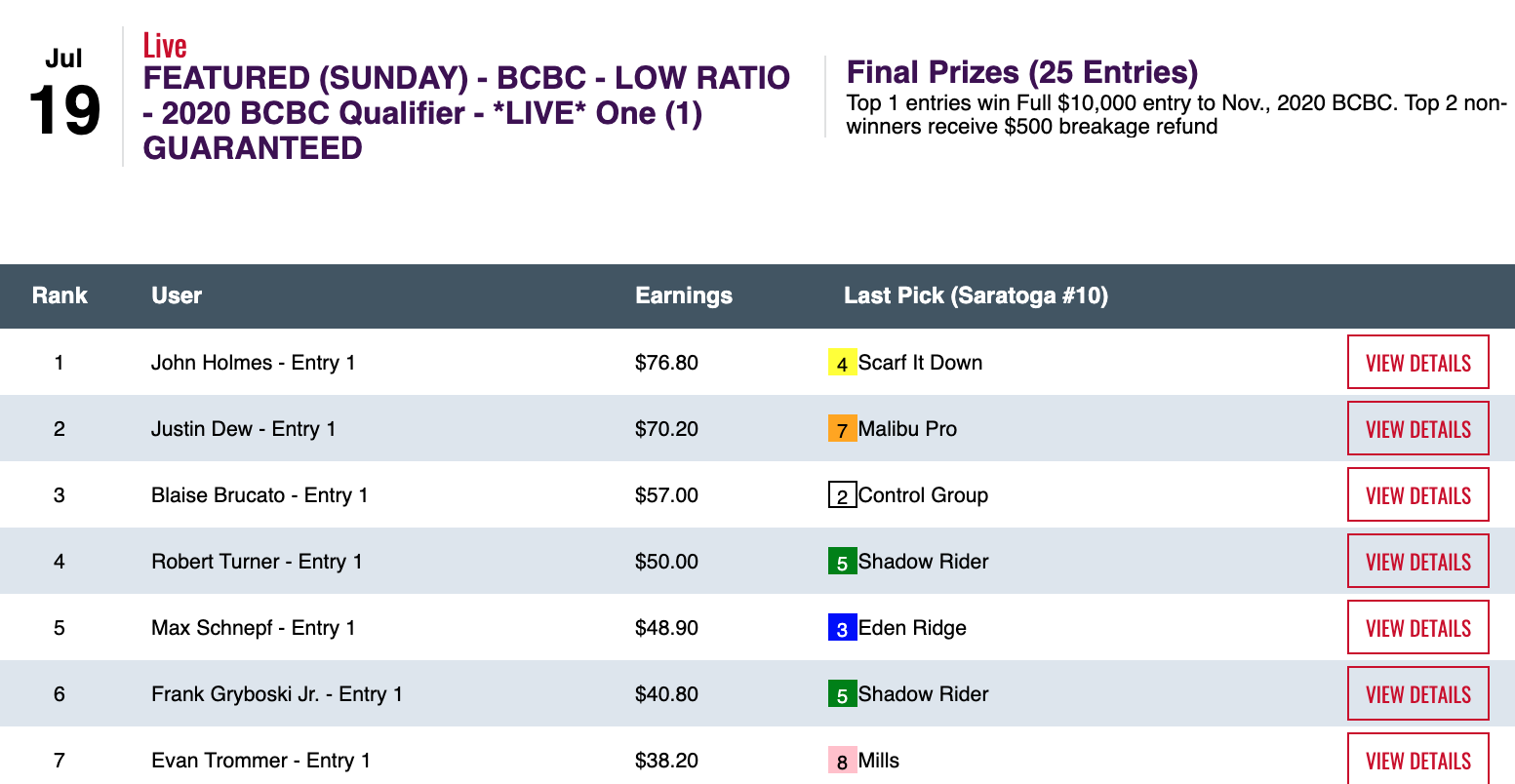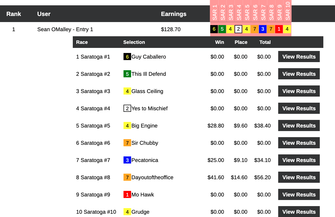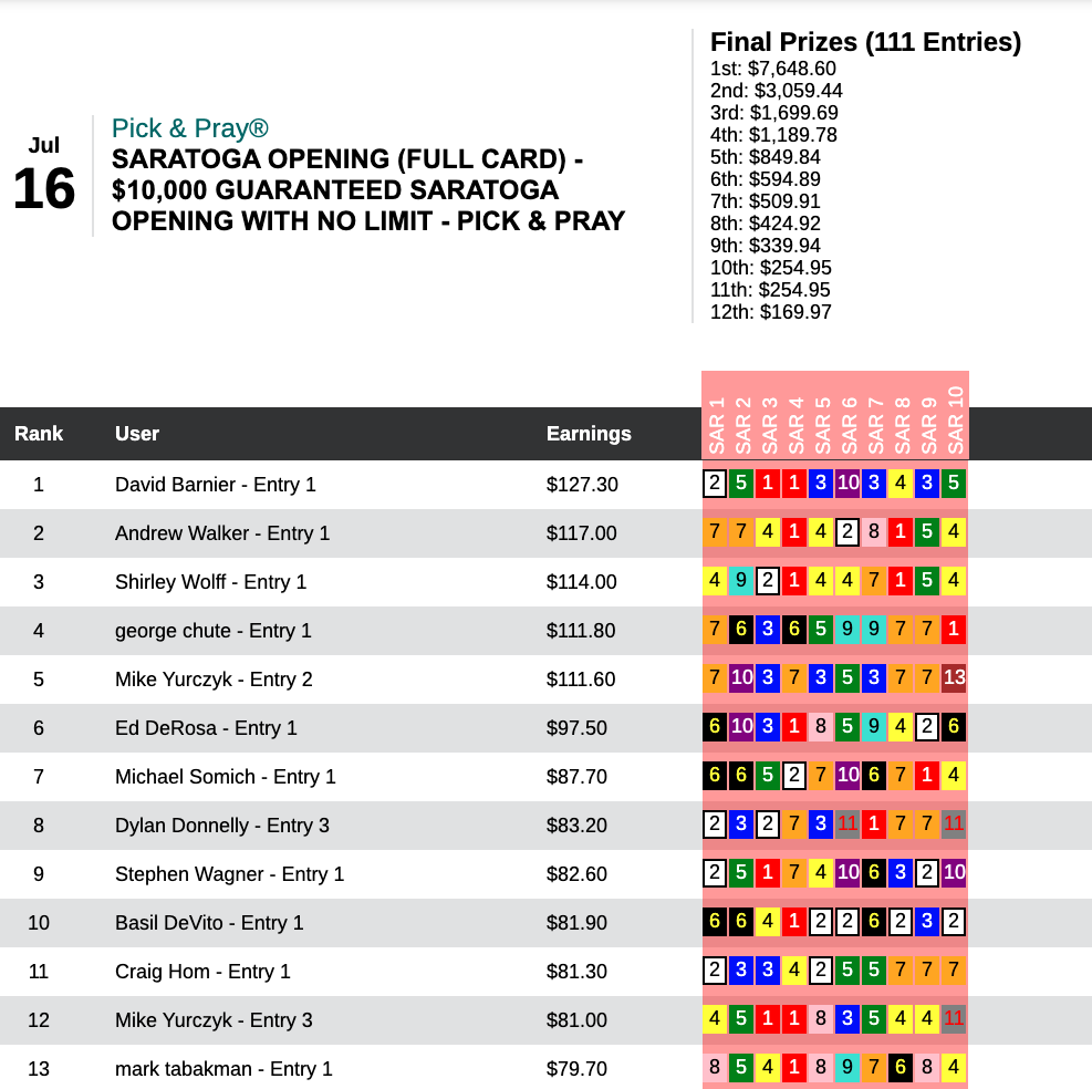 This one was a tight, defensive-minded struggle. Kyle Levy was the one who emerged with the sought-after $10,000 entry. His big blow among 3 firsts and 1 second was landed by Shalako in that 8th at Saratoga.