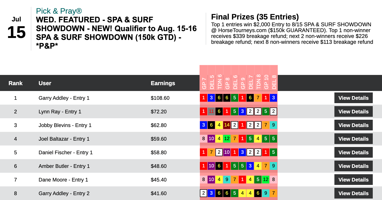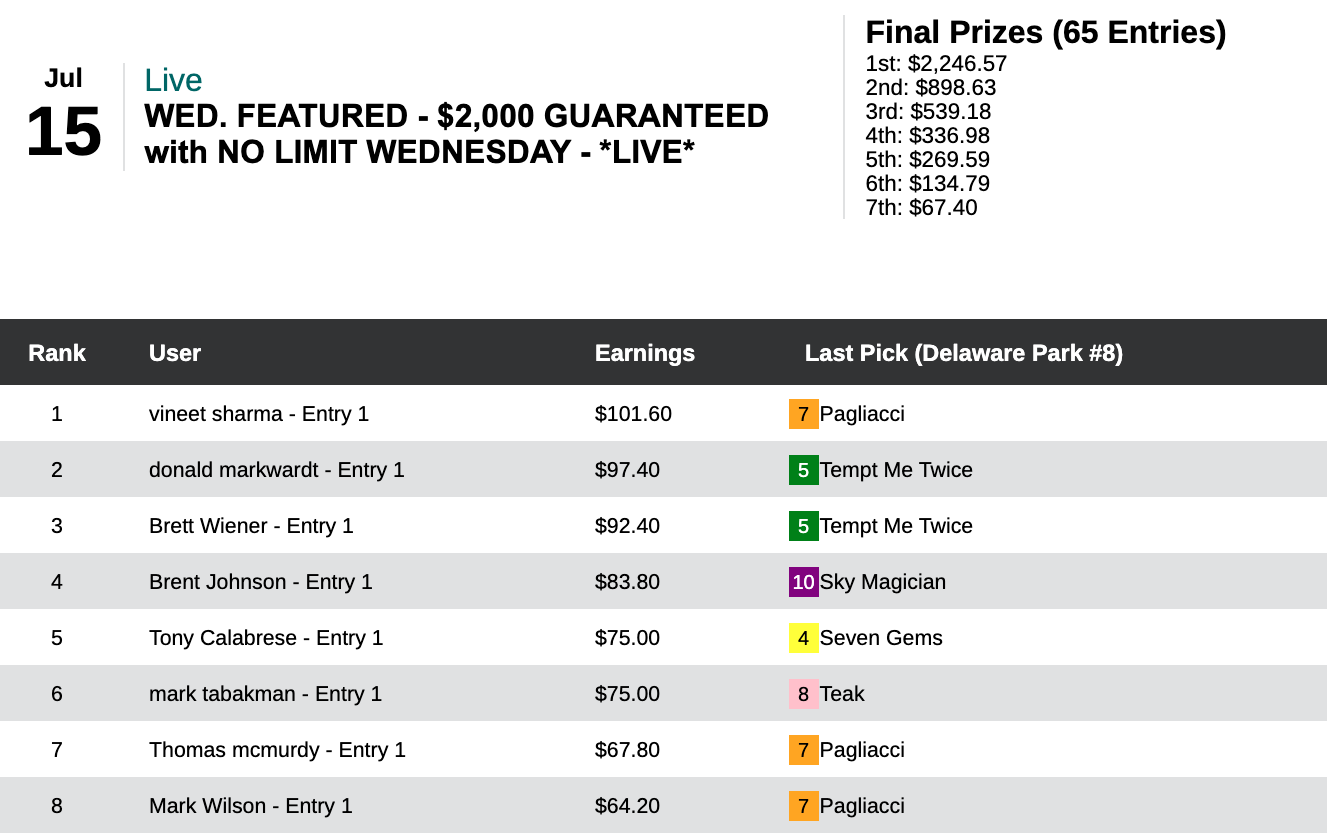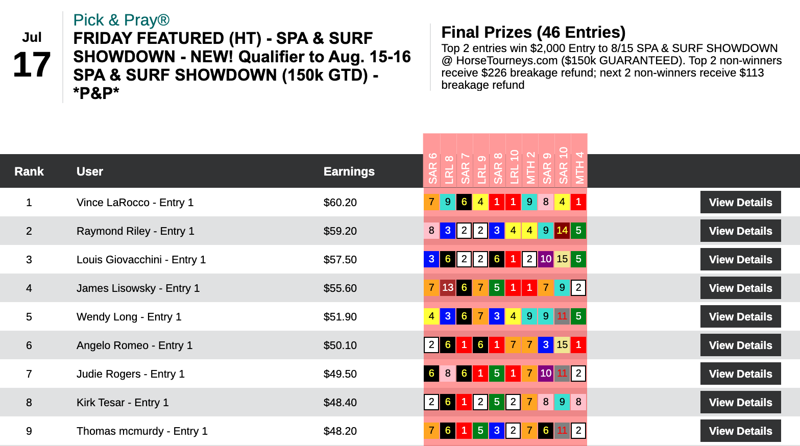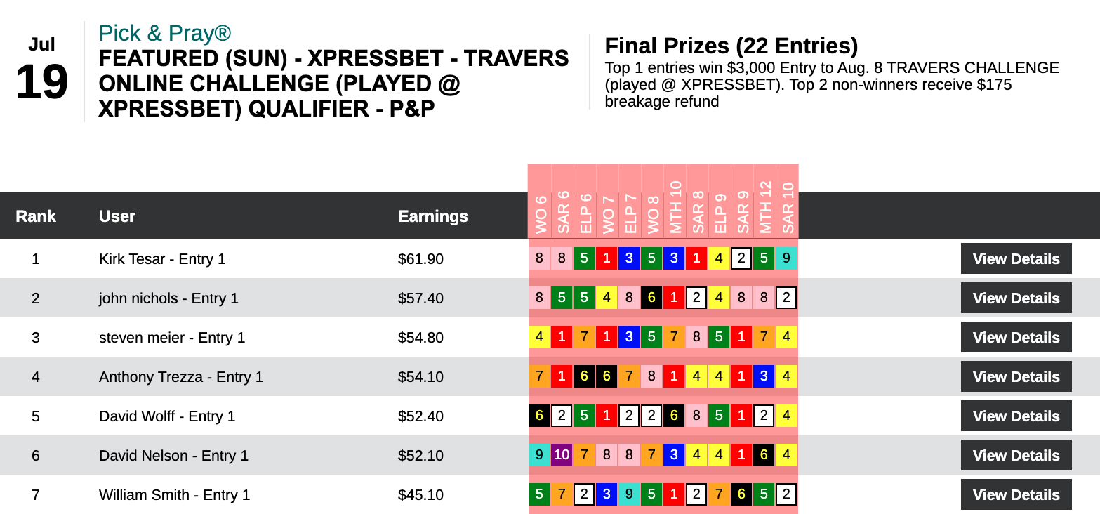 This one was a tight, defensive-minded struggle. Kyle Levy was the one who emerged with the sought-after $10,000 entry. His big blow among 3 firsts and 1 second was landed by Shalako in that 8th at Saratoga.
