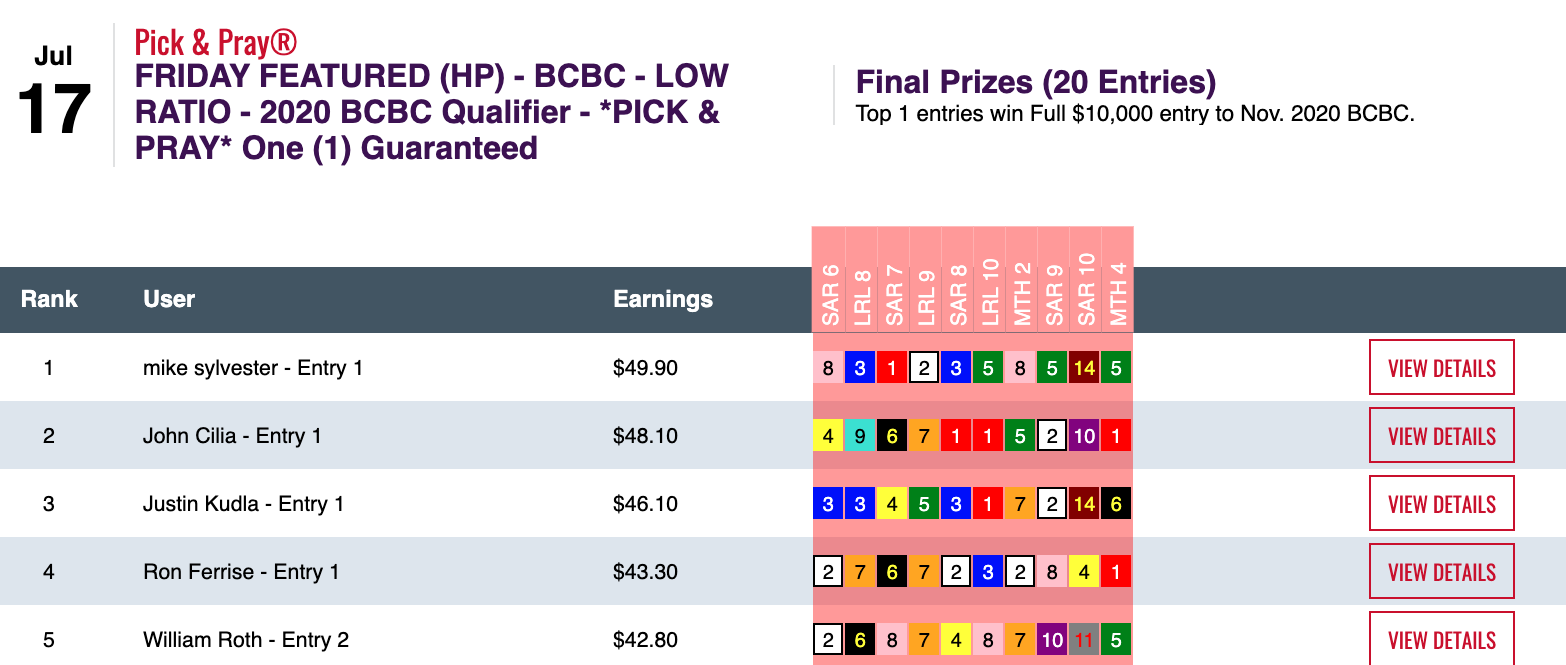 So, effectively (in more than one sense of the word), Lisowsky treated this 10-plays-from-25 races, All Optional Live game as a Pick & Pray. Of course, Lisowsky has never been averse to somewhat atypical entry strategies.