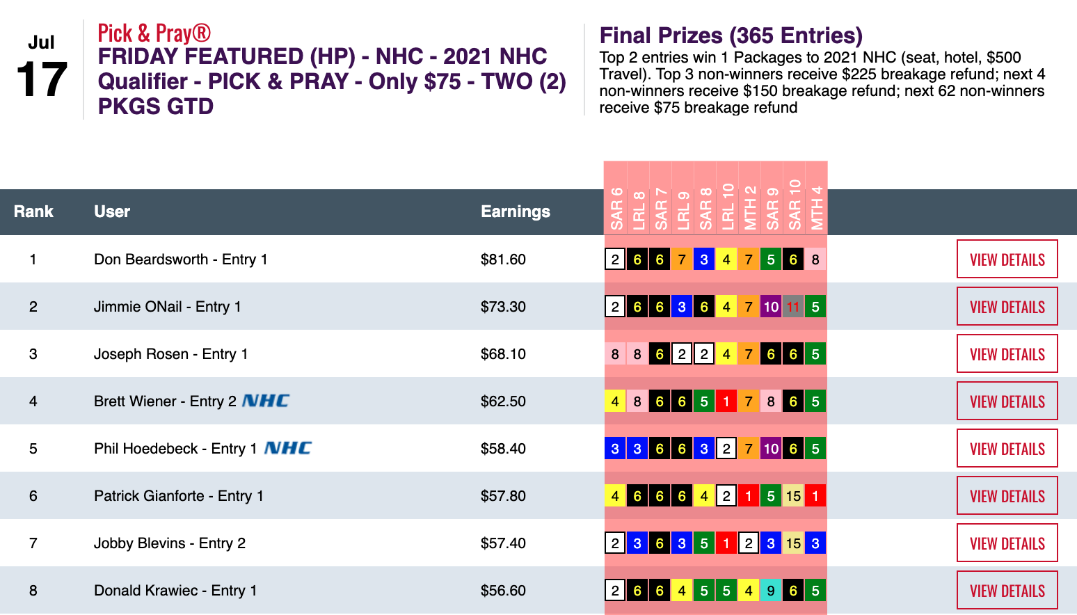 Here, Engelhard was topped only by Josh Thorpe (4 wins, 2 places). But the Pick Your Prize event is always popular—and it’s coming up quickly (July 25). So there were enough entries for four $2,000 entries to be awarded, and those went to Jerry McClenin and NHC Hall of Famer Steve Wolfson Sr. (who was kind enough to include the “Sr.” in his entry name this time around so that I could easily distinguish him from the other NHC Hall of Famer in the family!).