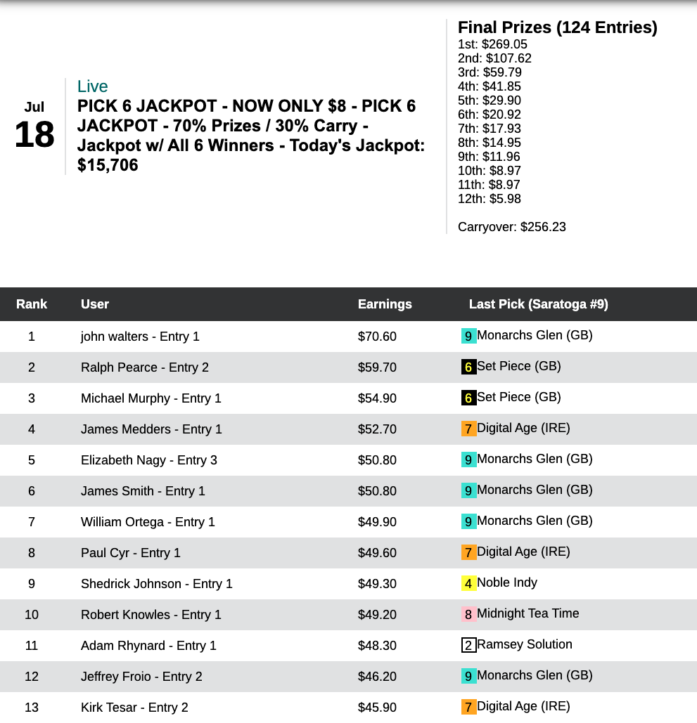 John Walters won it with just a pair on “on-toppers”. That led to a $15,962 Jackpot carryover on Sunday when Steven Meier took top honors with three winners. Interestingly, Meier had the three longest priced winners ($11.40, $11.60, $9.00) but not the three shorter-priced ones. Next Saturday’s Jackpot carryover, since no one got all six correct, will be $16,315.