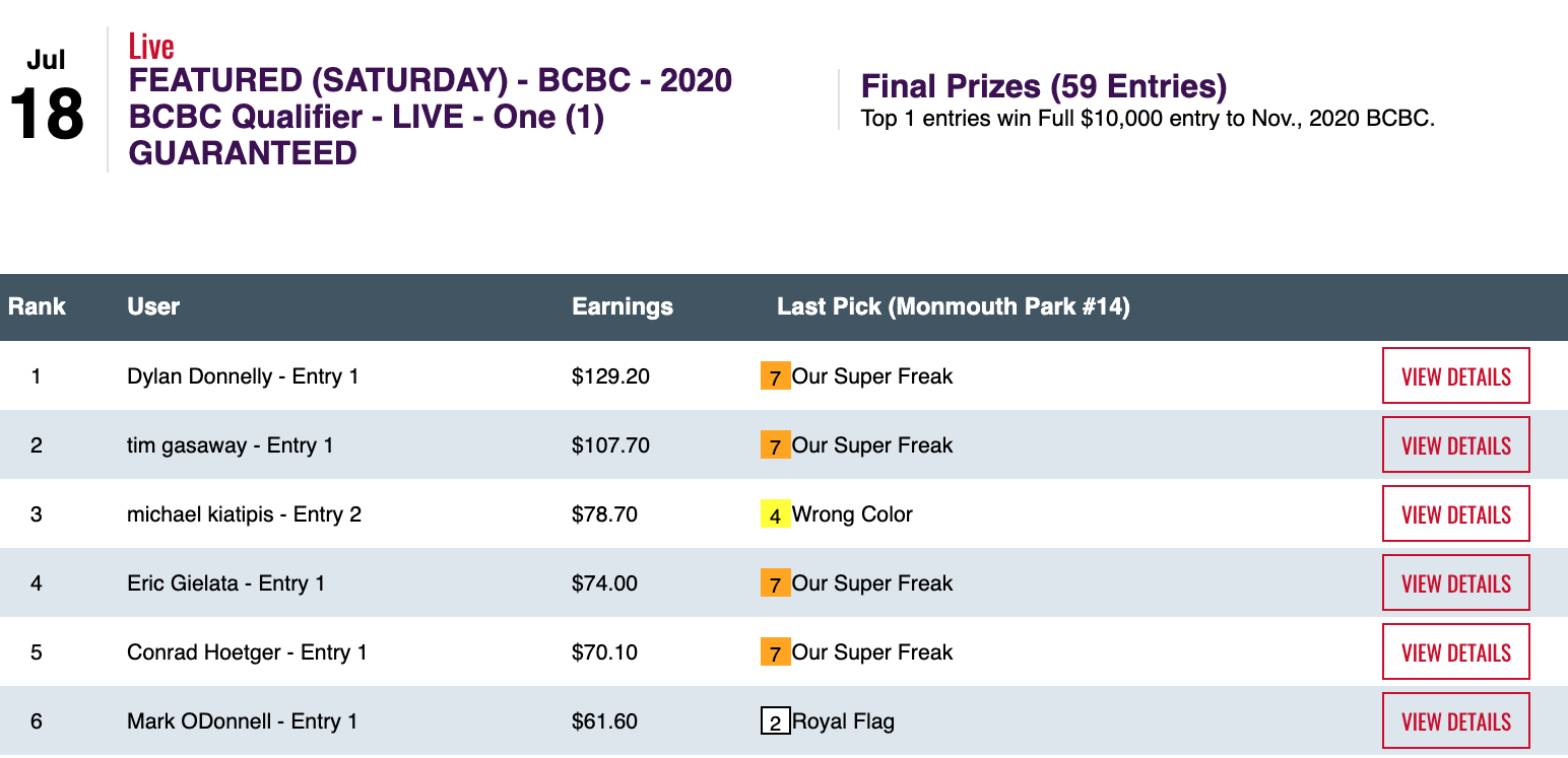 Last but far from least was Donnelly’s performance in the “regular” Breeders’ Cup Betting Challenge qualifier at HorsePlayers.