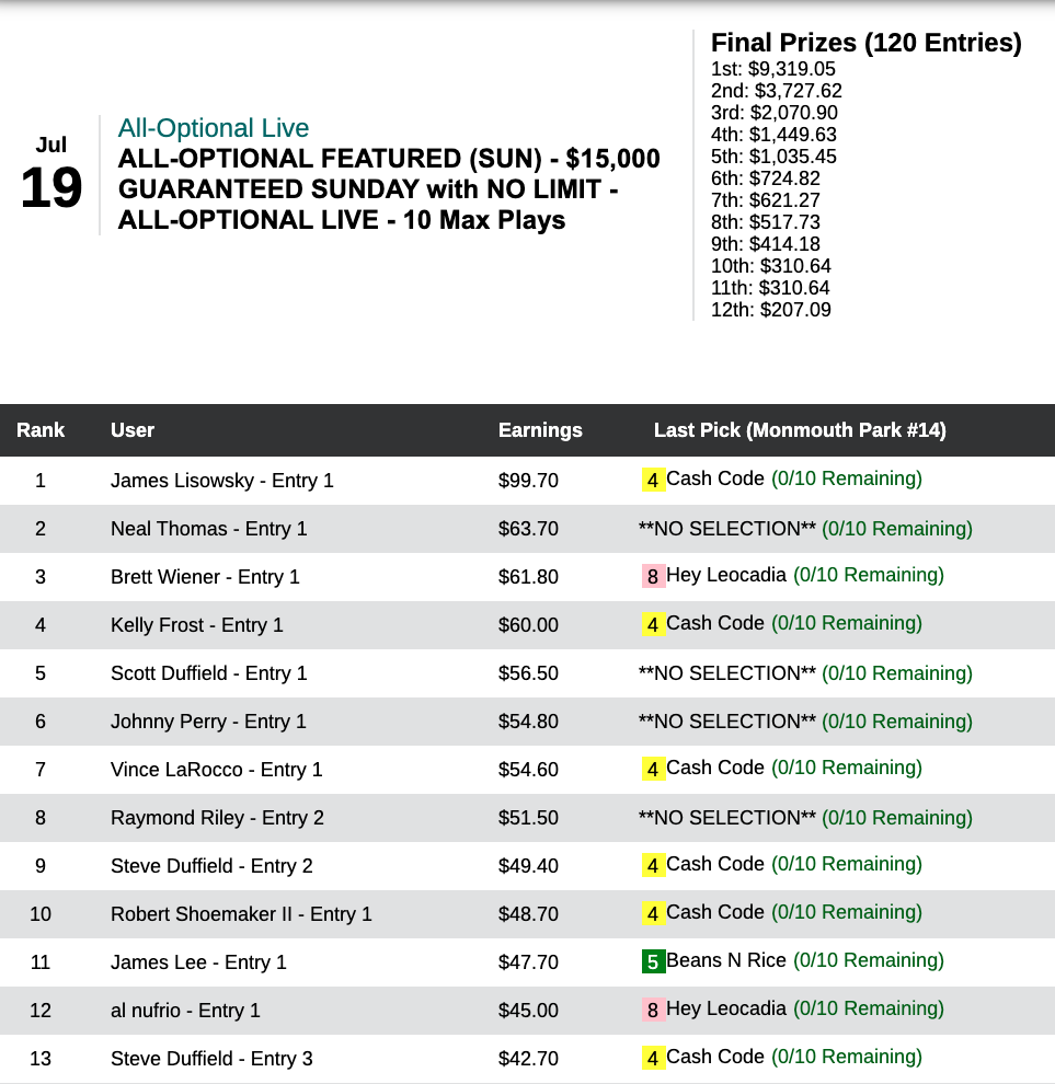 Cash Code ($21.20, $9.60) in the 14th at Monmouth was like a cheat code for Lisowsky in Sunday’s $7,500 Big Bucks tourney, which was played in All Optional Live format…and which he won by a whopping $59.00. Lisowsky picked up $9,261 from a pot of $13,230.