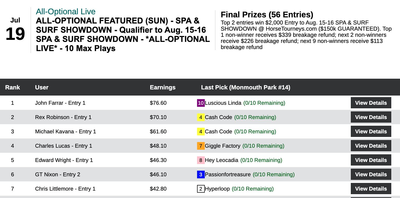 Vince LaRocco cashed a place ticket for $4.60 in that Monmouth race 4 to claw his way to the top in Friday’s Spa & Surf Showdown qualifier. Also earning a $2,000 entry was runner up Raymond Riley (4W, 4P).