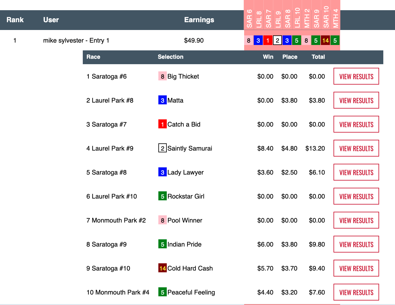 Richards only had 2 firsts and a second, but the place horse was a maximum $22.00 collection, one of the winners was a 10-1 shot, and the other was Lights Down Low in an $8,000 claimer—race 6 at Monmouth—that was not part of our regular 12-race featured schedule. Lights Down Low won and returned $103.60 to win and $31.40 to place. Obviously that was trimmed down to $42.00 and $22.00 for contest purposes…but this is why some people enjoy the All Optional Live format. You get to play races that we otherwise wouldn’t include.
