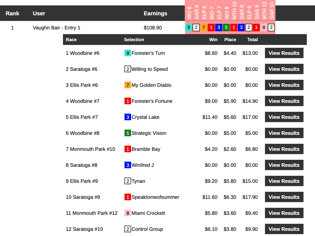 Bair was a bear to his opponents, recording 8 wins and a place. Here is his Sunday scorecard: