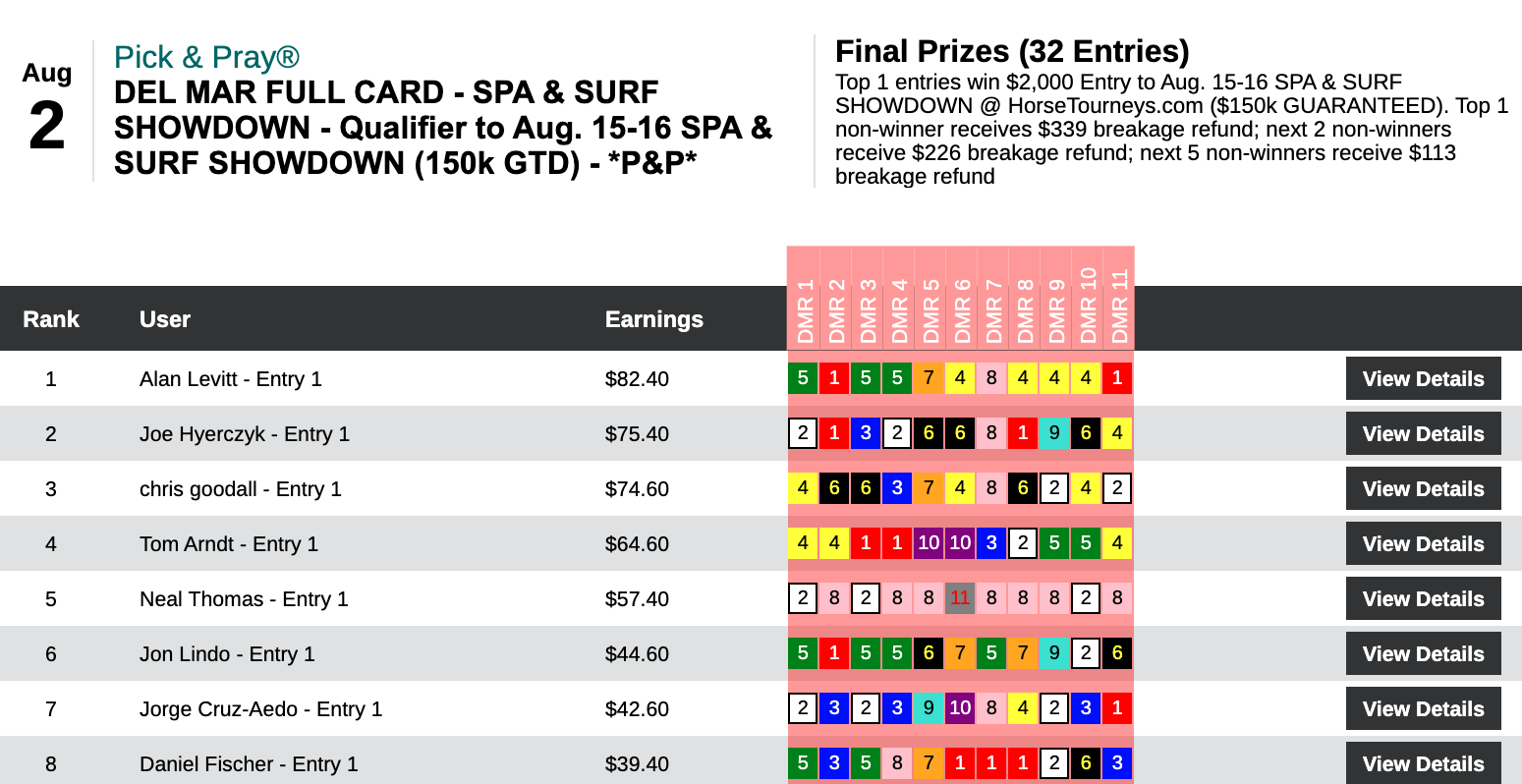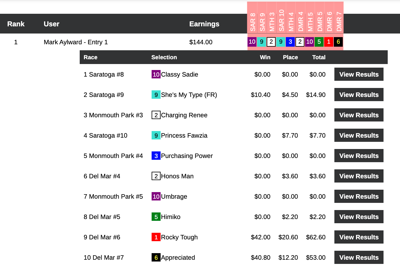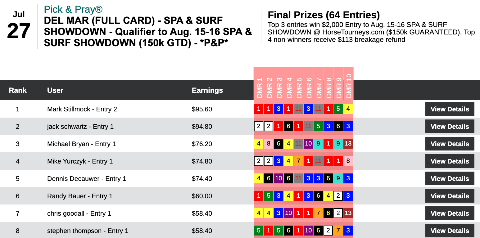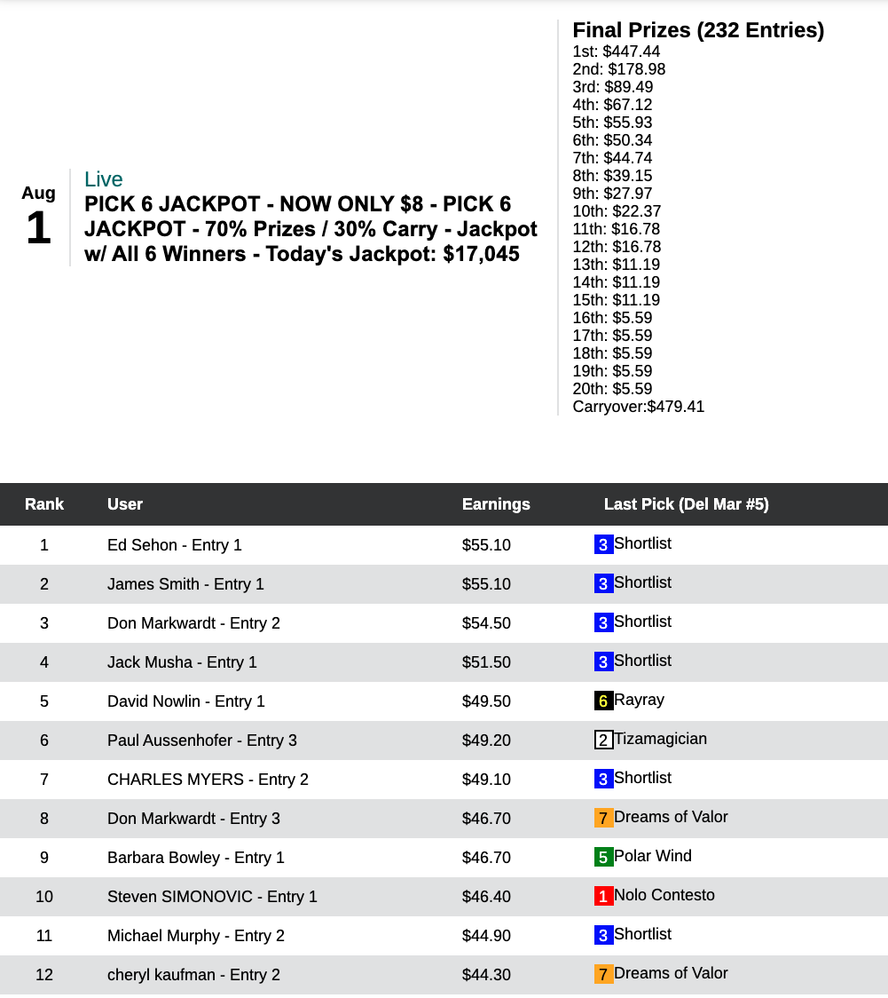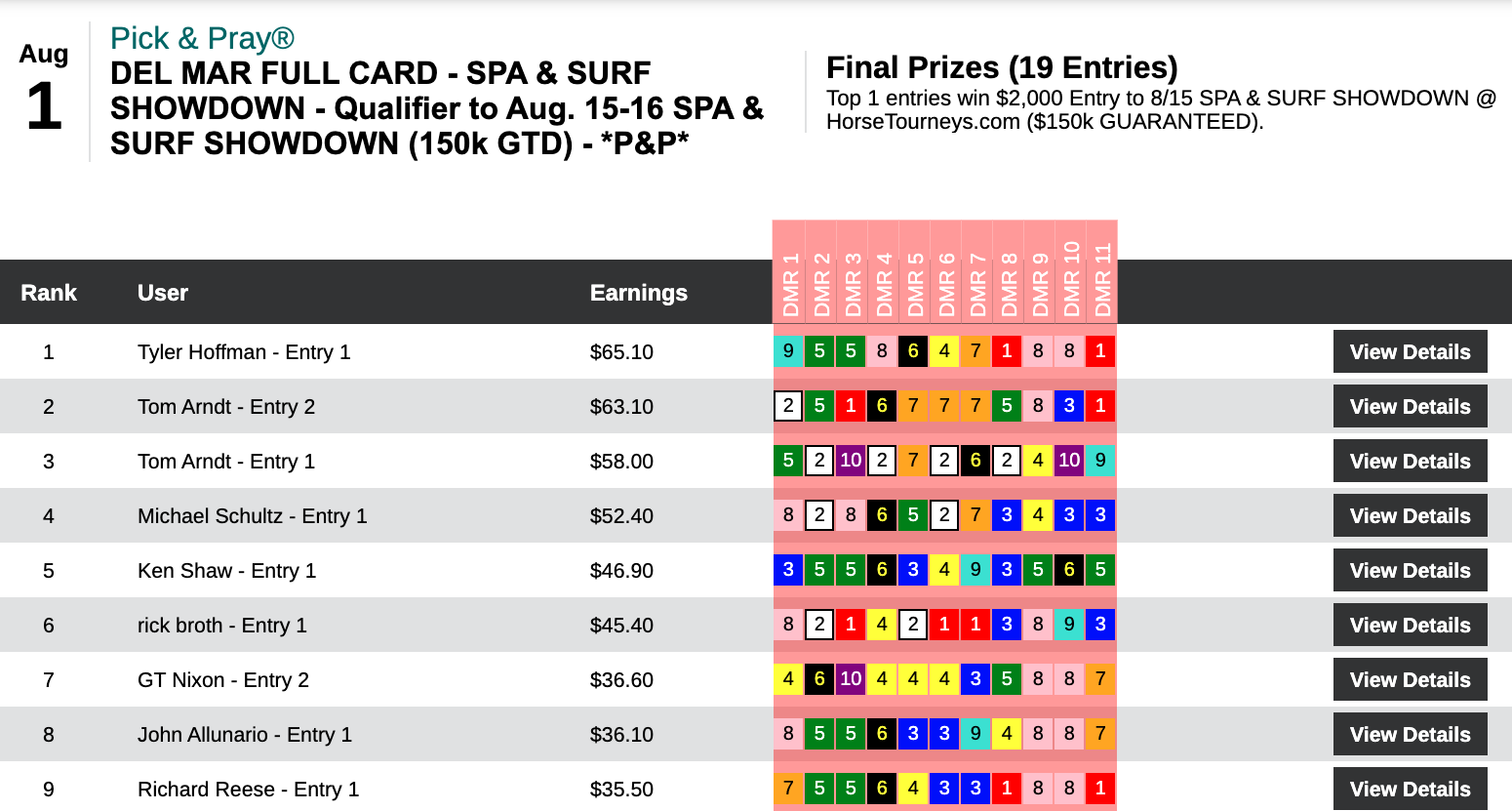 Tyler Hoffman squeaked out a $2.00 victory in the Del Mar version, thanks to 4 firsts and 3 seconds.