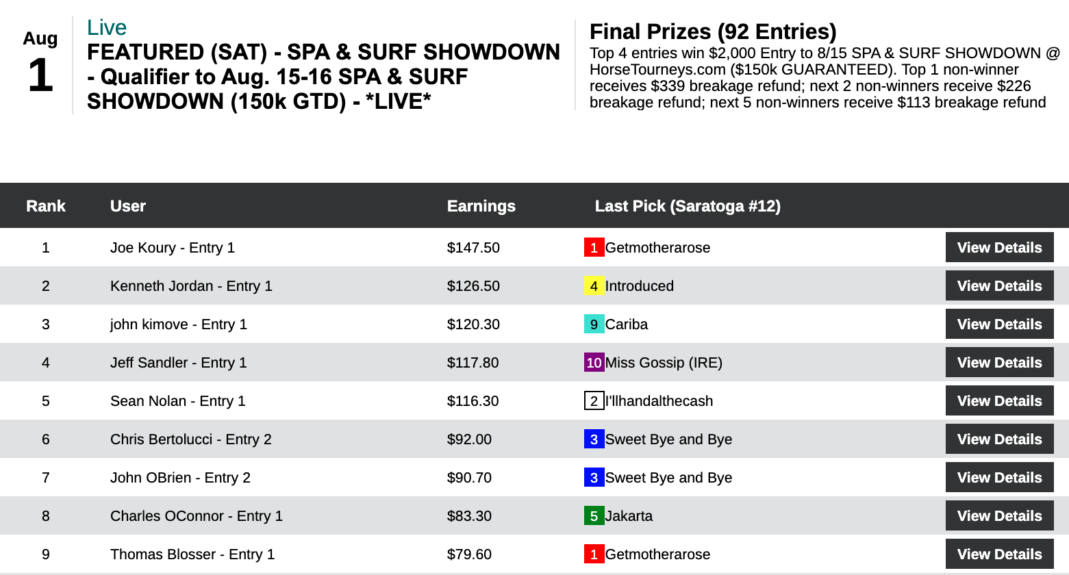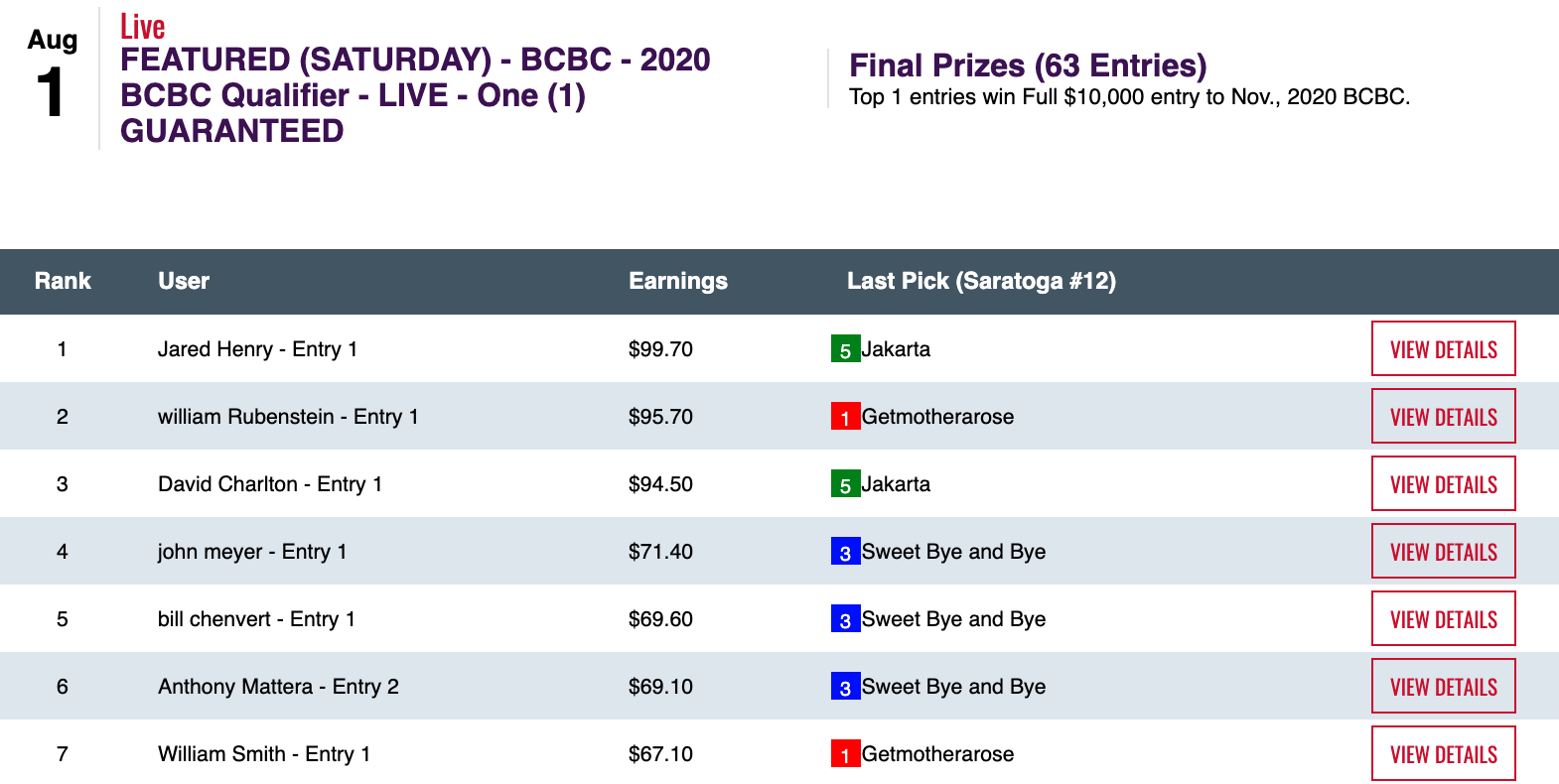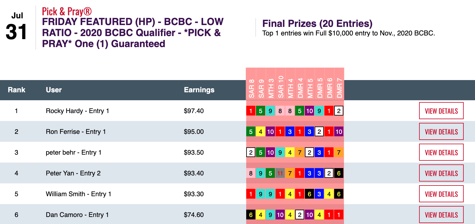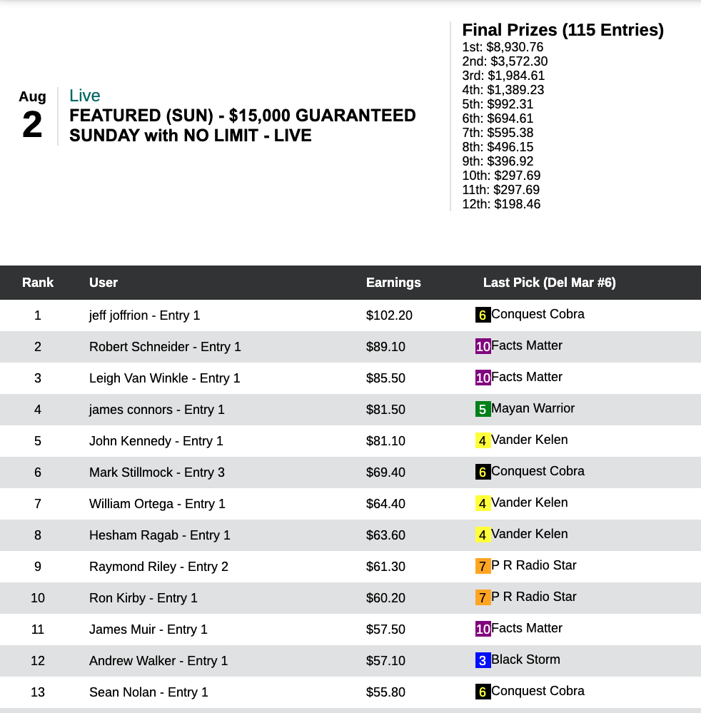 …it meant that three more players earned $2,000 entries to the online cash game here on August 15-16. Congratulations to Mark Stillmock (4 wins, 2 places), Jack Schwartz (2 wins, 2 places…including a 12-1 winner in the last race) and Michael Bryan, who got up for third in the last race by virtue of a $3.40 place collection.