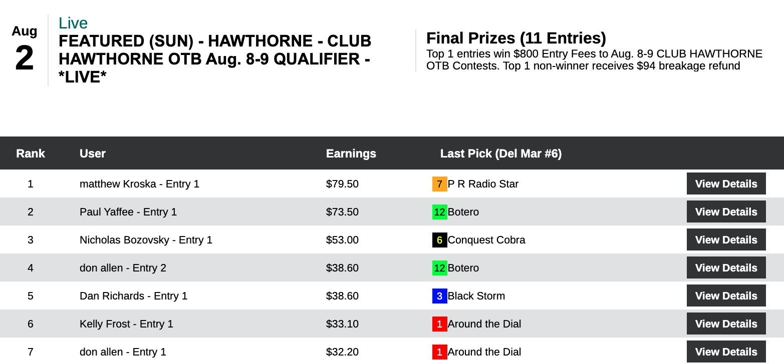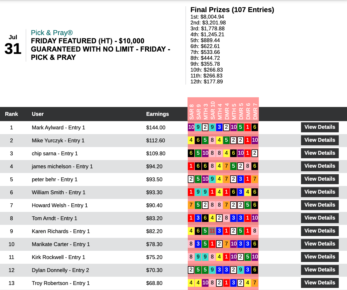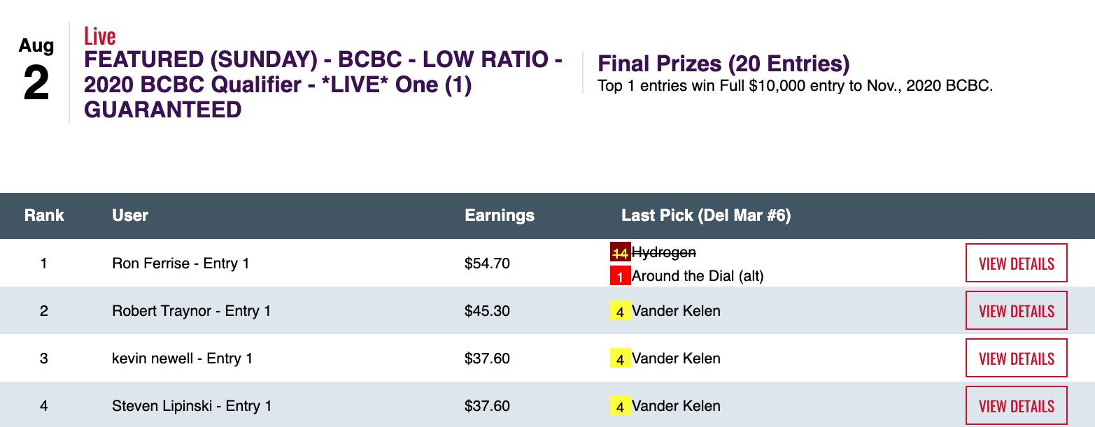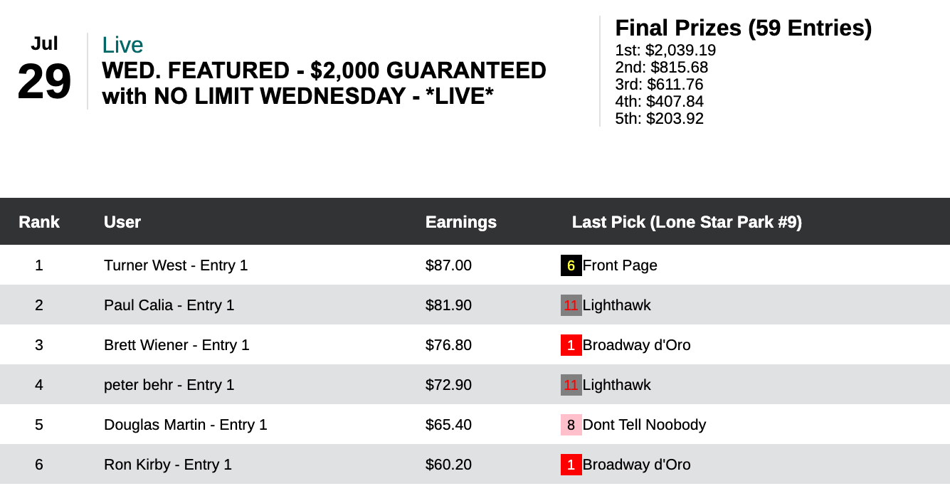 …it meant that three more players earned $2,000 entries to the online cash game here on August 15-16. Congratulations to Mark Stillmock (4 wins, 2 places), Jack Schwartz (2 wins, 2 places…including a 12-1 winner in the last race) and Michael Bryan, who got up for third in the last race by virtue of a $3.40 place collection.