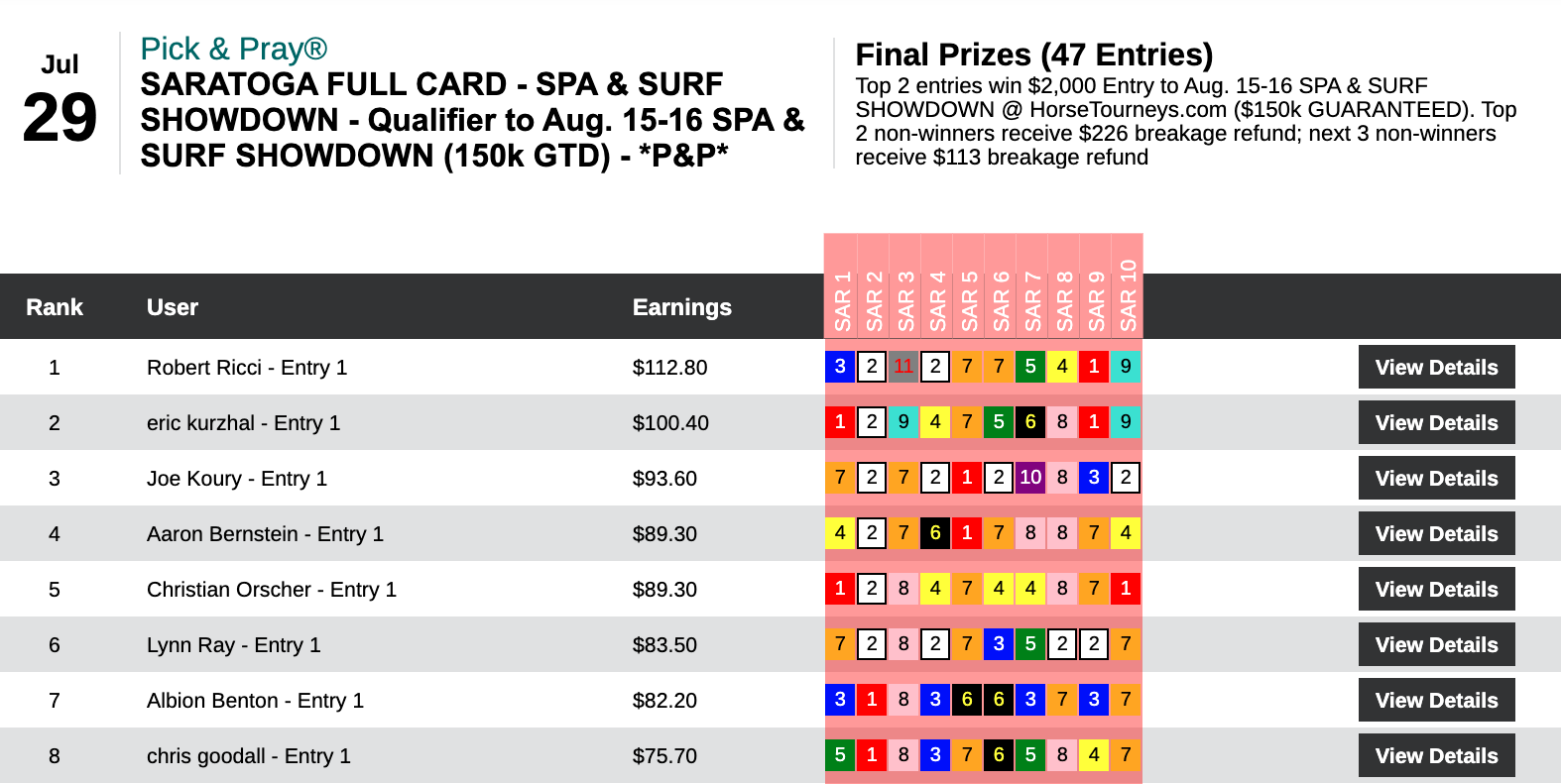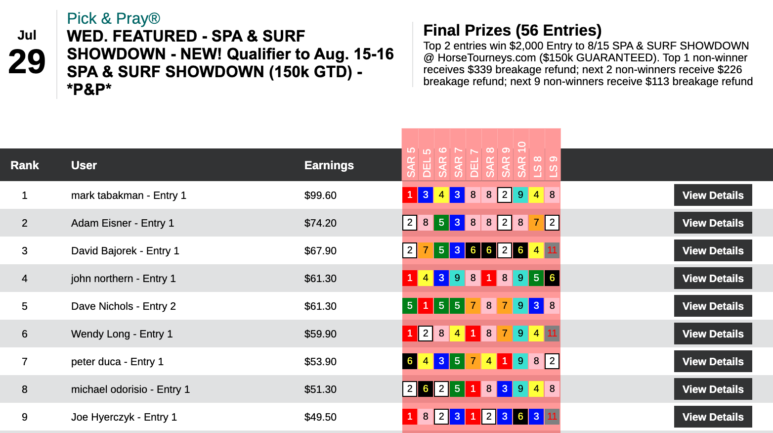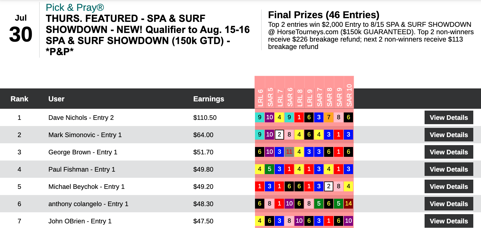 Robert Ricci (2 wins, 2 places) and Eric Kurzhal (3W, 1P) were the winners here. Both had 23-1 winner Whistlinginthtedark in race 2 of our Spa-only Spa & Surf qualifier. Ricci added Readyforprimetime ($24.60, $11.60) in the 7th, while Kurzhal needed a 7-1 last-race winner in Zero to Sixty to get up for the other $2,000 entry.