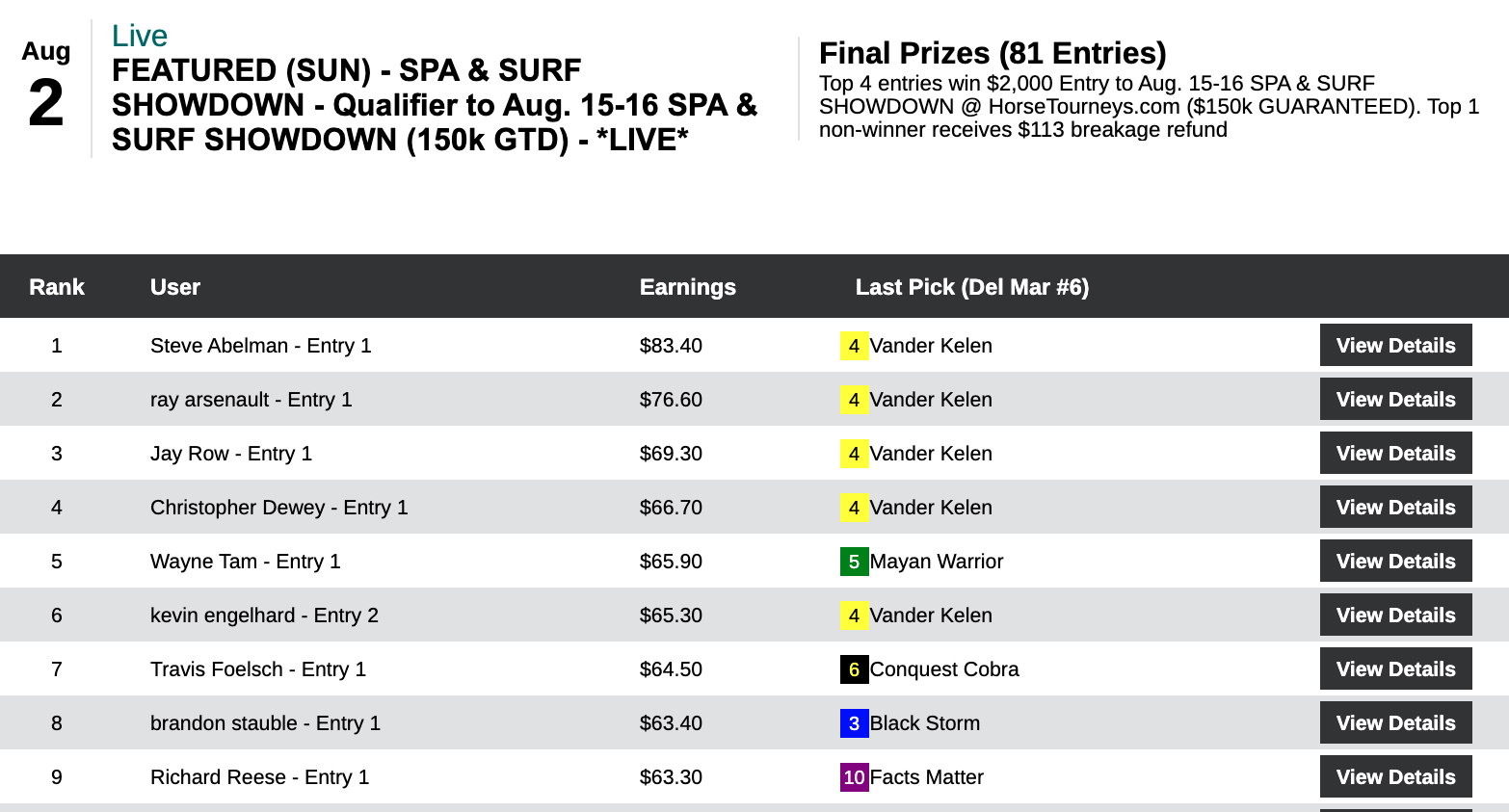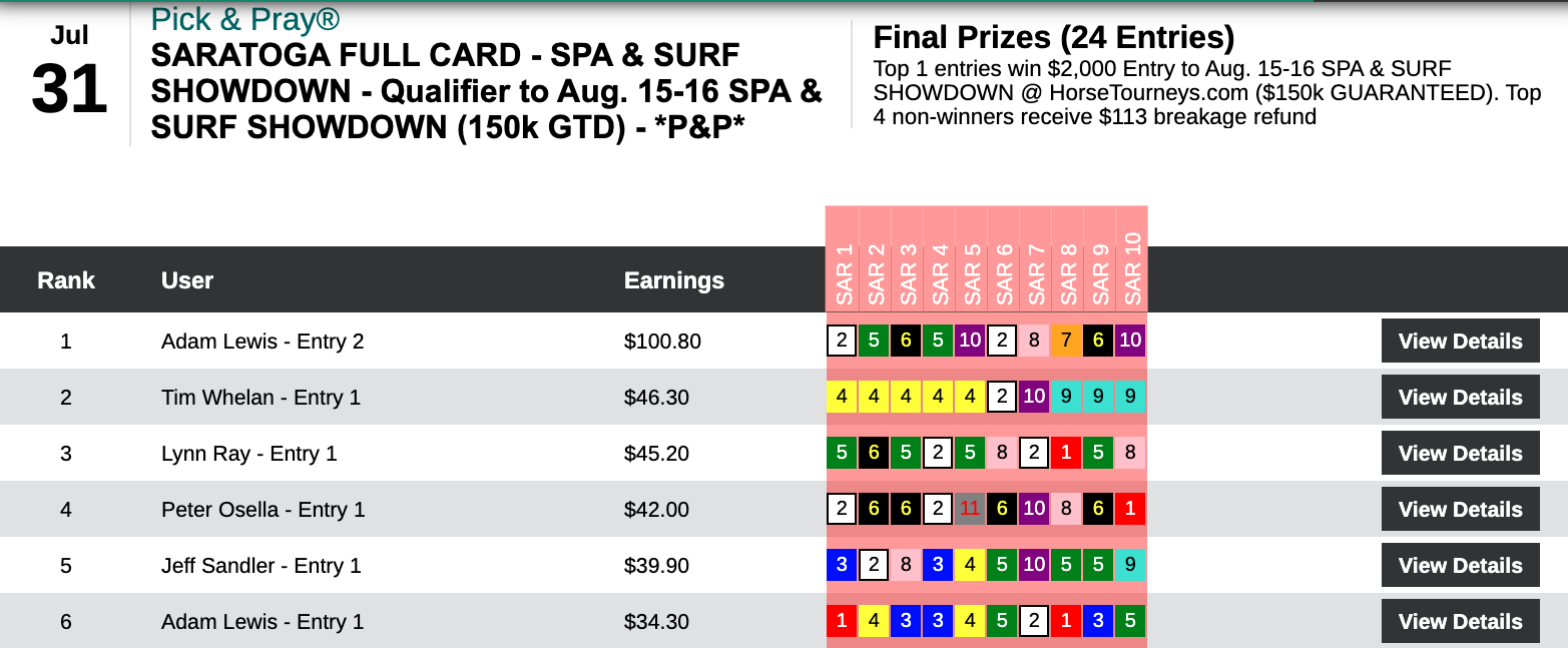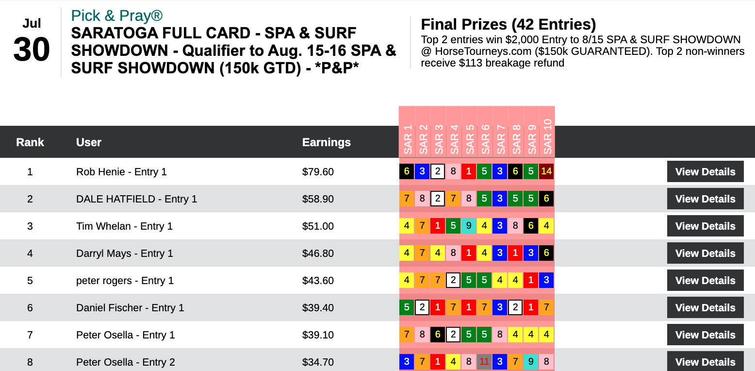 Robert Ricci (2 wins, 2 places) and Eric Kurzhal (3W, 1P) were the winners here. Both had 23-1 winner Whistlinginthtedark in race 2 of our Spa-only Spa & Surf qualifier. Ricci added Readyforprimetime ($24.60, $11.60) in the 7th, while Kurzhal needed a 7-1 last-race winner in Zero to Sixty to get up for the other $2,000 entry.