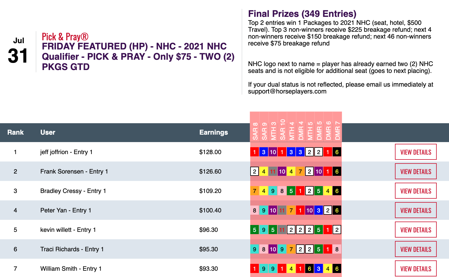 Scores were tight between the top two in Saturday’s NHC qualifier at HorsePlayers. Fortunately for them, this was a two-seats-guaranteed affair.