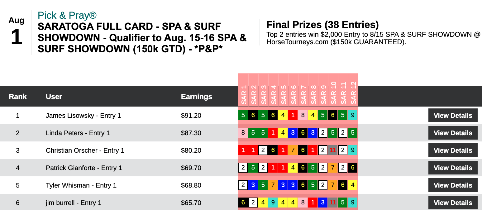 Meanwhile Jim Lisowsky (3 wins, 1 place) and Linda Peters (4W, 2P) took the Saratoga-only qualifier.
