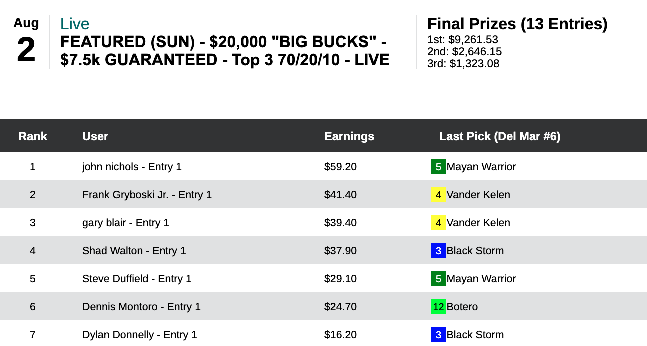 Aylward clicked with winners at odds of 29-1 and 19-1 in the final two races to walk away with top money of $8,004 out of a total pot of $17,788. His score of $144.00 was the day’s best.