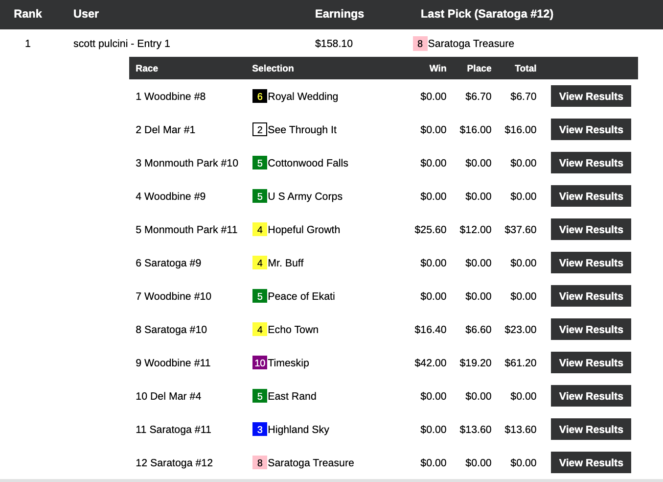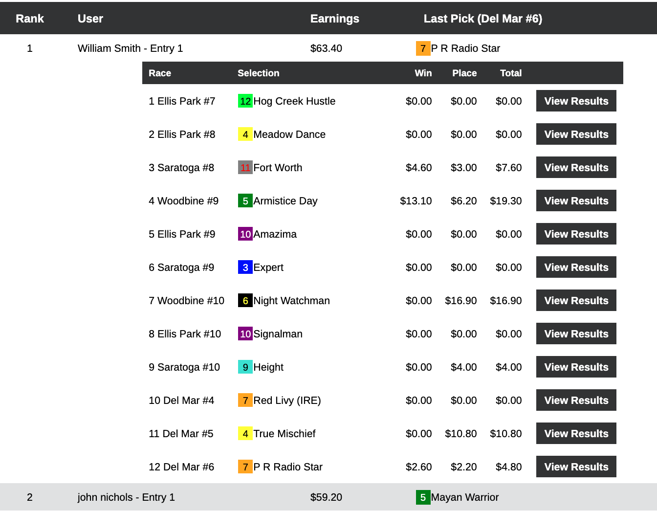 John “The Clocker” Nichols took this one with 2 wins (including English Affair) plus 2 places. All four of his collections came during the first six races. The end result was a first prize of $9,261 out of a total prize pool of $13,230.