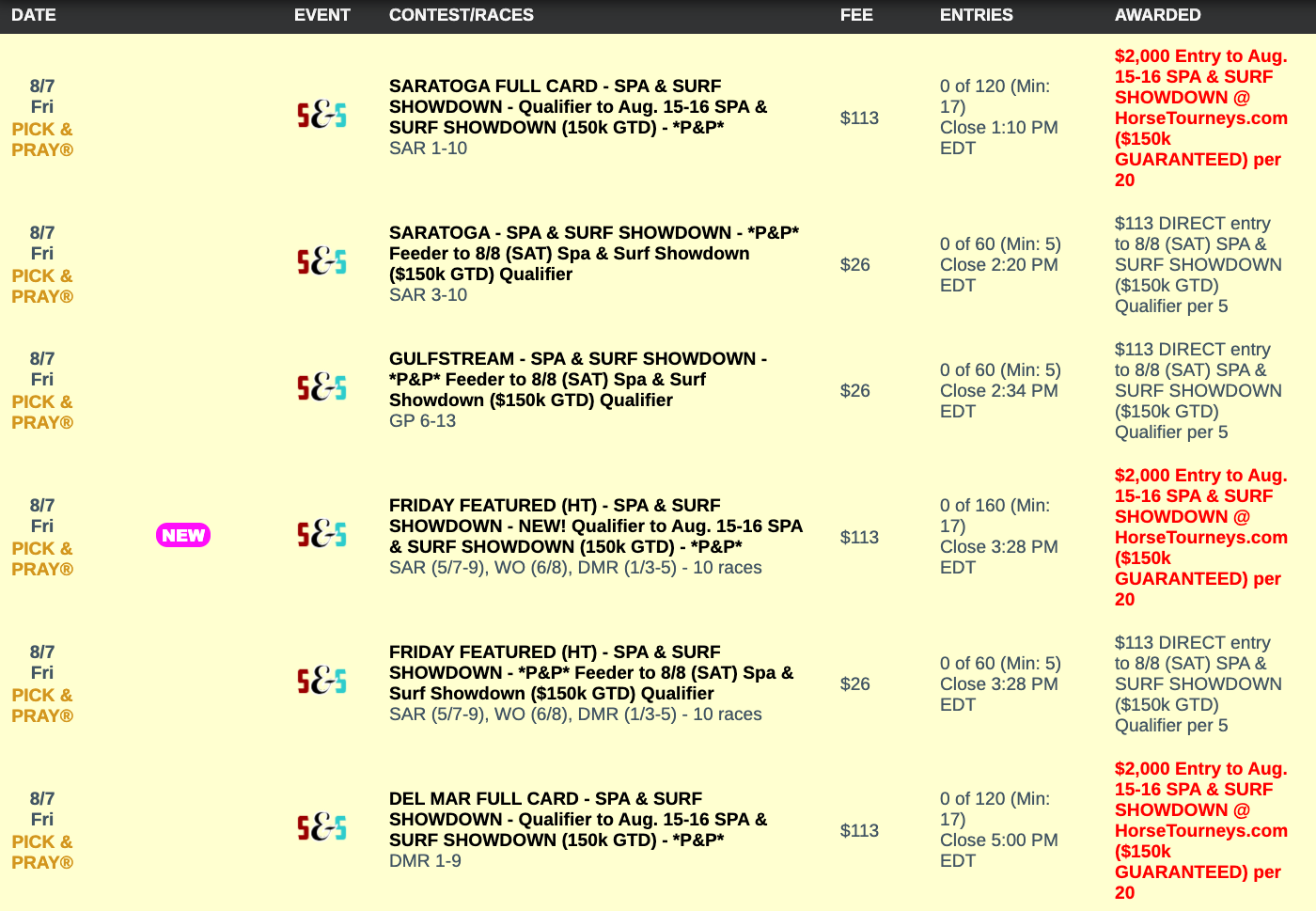 Remember how I said we’d have three Spa & Surf Showdown qualifiers on Friday, Saturday and Sunday? Actually I undercounted. On Saturday and Sunday, we’ll have four! There’s our Saratoga-only qualifier, our Del Mar-only qualifier and our multi-track play-in—all priced at $113 per entry and offering one $2,000 prize/seat per 20 entries. The fourth Showdown qualifier is a 1-per-8, Low Ratio Pick & Pray. It’s a multi-track affair with an entry feel of $290.