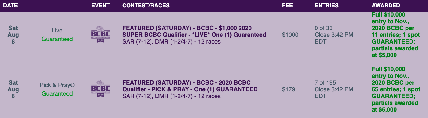 Saturday’s “regular” BCBC play-in has one grand prize guaranteed and carries an entry fee of $179. It’s a Pick & Pray with a winning ratio of 1-per-65.