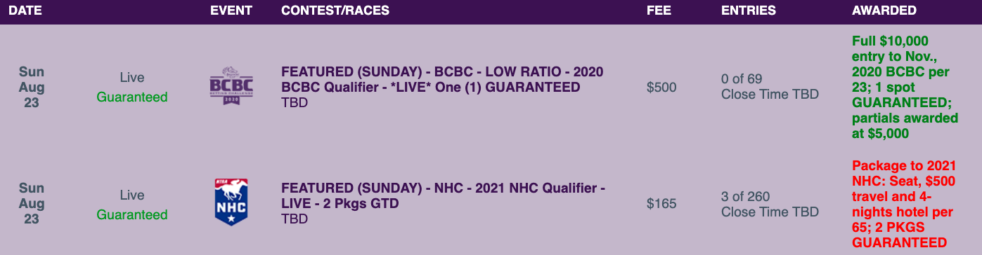 The second of the weekend’s two $8 Pick 6 Jackpot tourneys takes place on Sunday. Check out our Twitter feed on Saturday night or home page on Sunday for an update on what the Jackpot will be. It will be based on how many people take a shot at the Saturday Jackpot ($19,478)…and whether anyone hits it. The Pick 6 Jackpot competition is always a live-format game.
