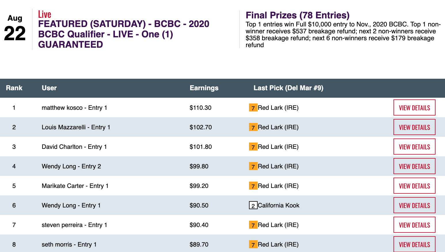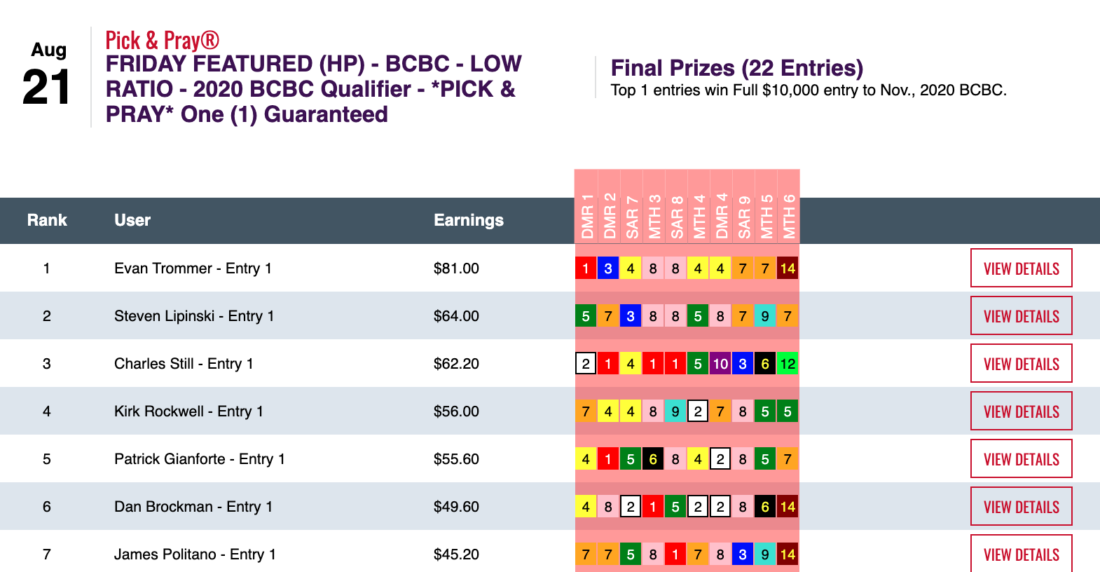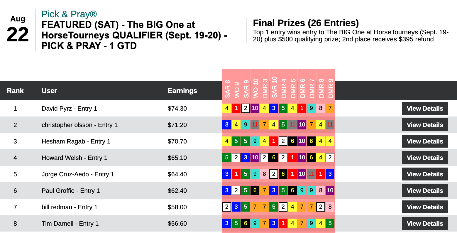 Eights were sort of wild in this one. Matthew Ransdell led the way with 4 wins and 4 places for a total of 8 collections. Dino Herrera (2 wins, 1 place) got up for second despite whiffing on the first 8 races. So while they took distinctly different paths to get there, both will wind up in the Land of Enchantment this Saturday.