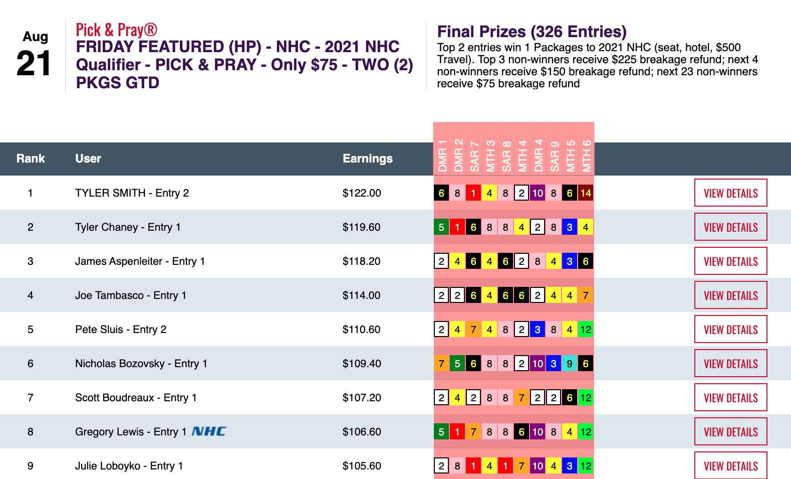 That’s tournament stalwart Robin Buser on top thanks to 3 wins and 2 places. We hope he didn’t allow his NHC Tour membership lapse…though we ARE a bit surprised that he wasn’t already qualified. He’s several months behind his usual schedule!