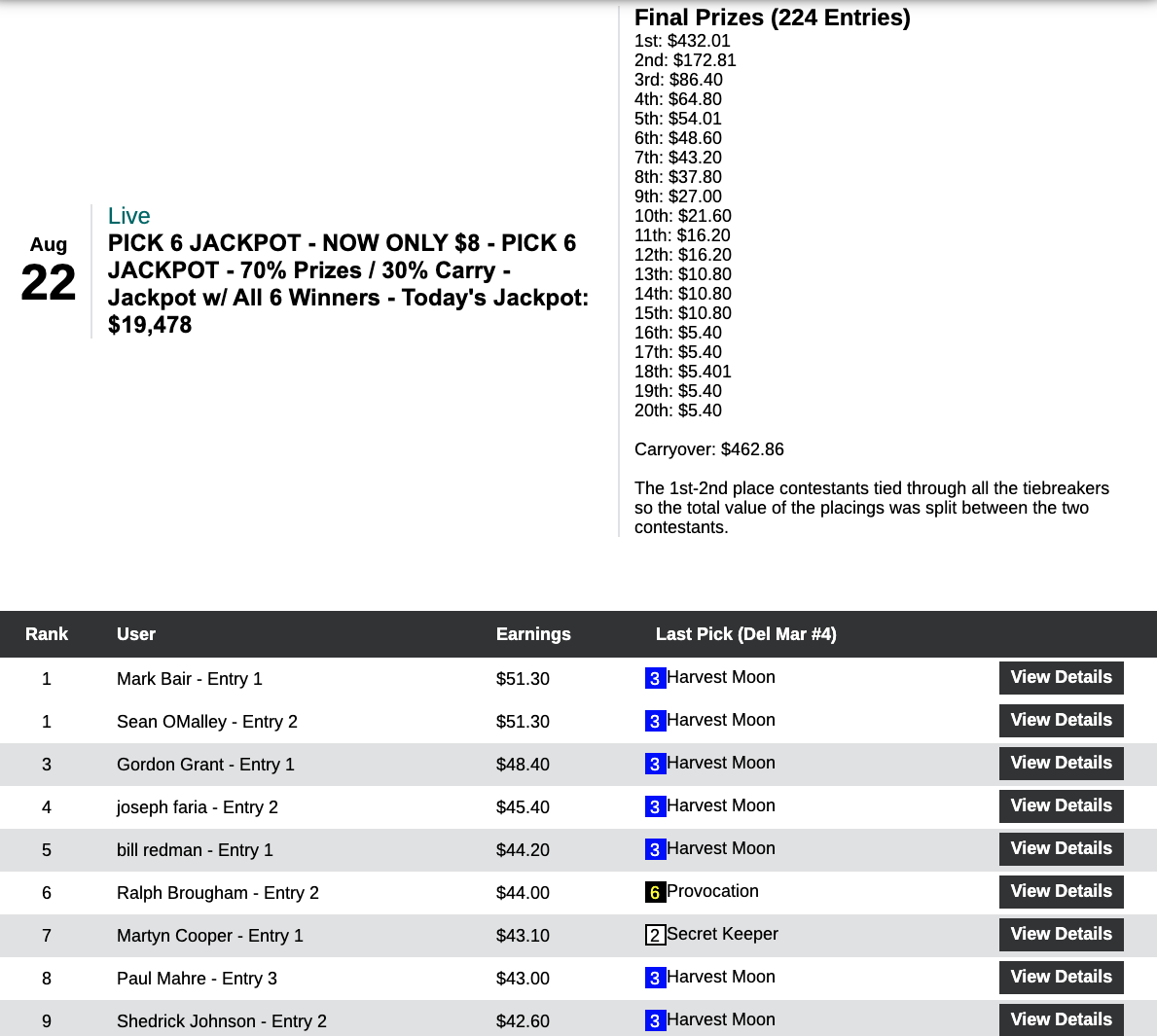 Conway (4 wins, 2 places) hit the last two races, including 19-1 Del Mar race 9 winner Red Lark to check out with the top prize of $15,221 in Saturday’s $260, $25,000 Guaranteed Pick & Pray, which closed with a purse of $33,824.