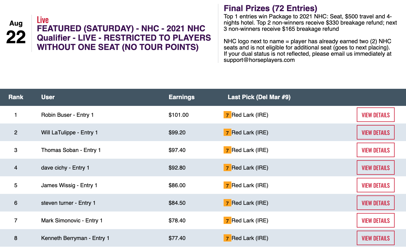 Pyrz only had 3 runners up to show for his first 11 selections, but he came up big with Red Lark in the Del Mar Oaks at the end to earn the right to be one of no more than 57 in the field for the “High Expectation Tournament” on September 19-20.