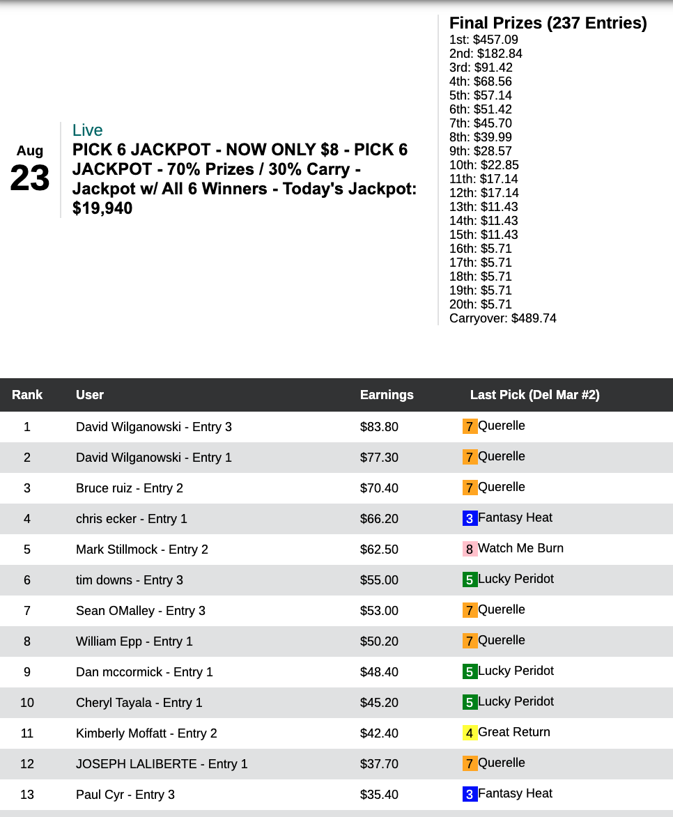 …but David Wilganowski picked 5 with one of his entries and 4 with his other. That gave him the top two spots. Also, this was a surprisingly rare instance in which the player (Wilganowski, in this case) who lasted the longest without a miss went on to win the game. A 14-1 winner in the first leg at Saratoga helped make that possible. (Often a person with a streak intact plays chalk late and can get passed by someone who stumbled early but catches a price near the end.) In any event, the Jackpot for next Saturday’s $8 Pick 6 get-together will begin at $20,429.