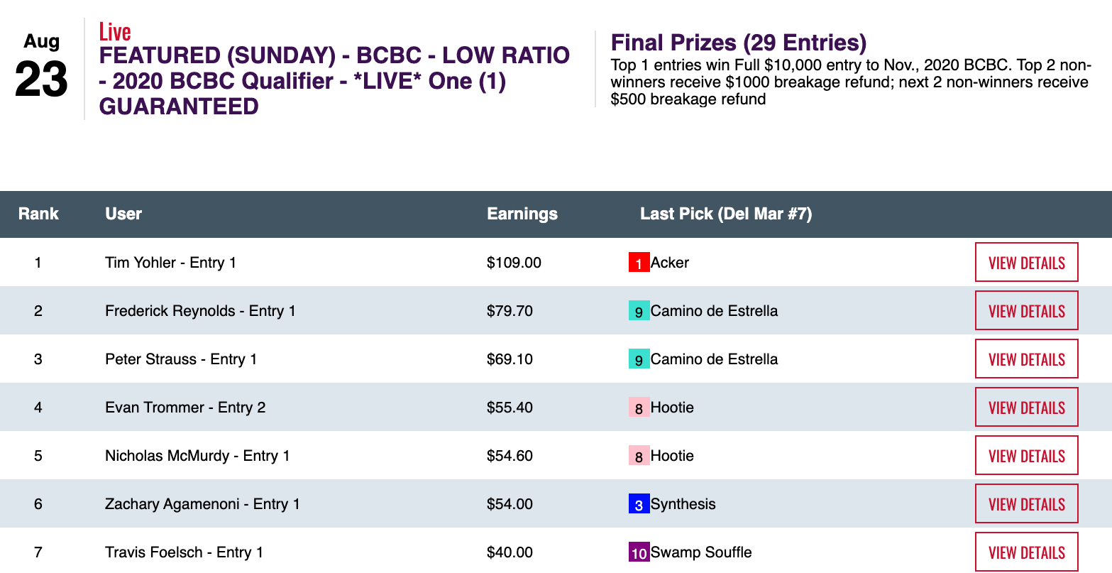For Trommer, it was his fourth featured-tourney victory over the last three weekends. Two of those four tallies netted him Breeders’ Cup Betting Challenge entries.