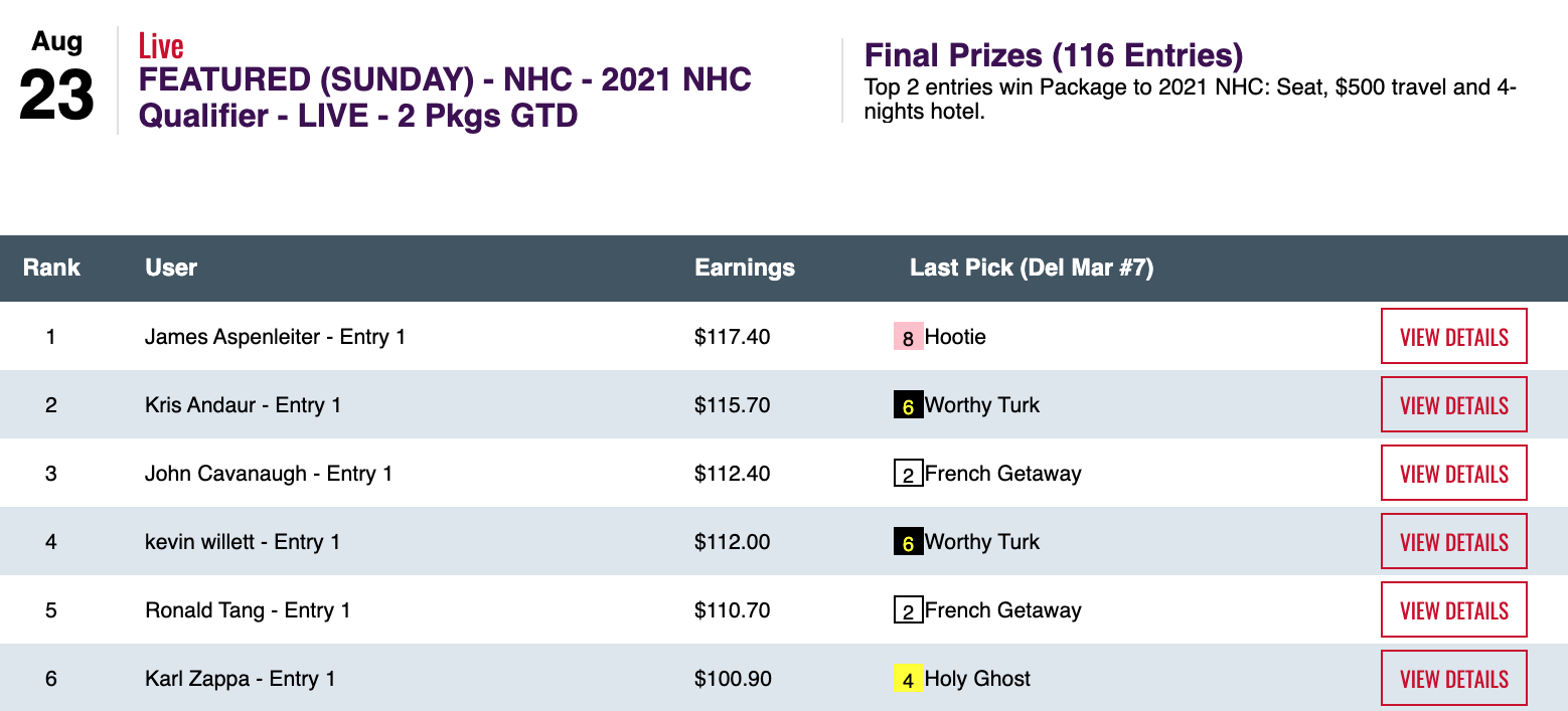 The two highest scores of Saturday/Sunday were turned by the top two finishers in Sunday’s NHC qualifier at HorsePlayers.