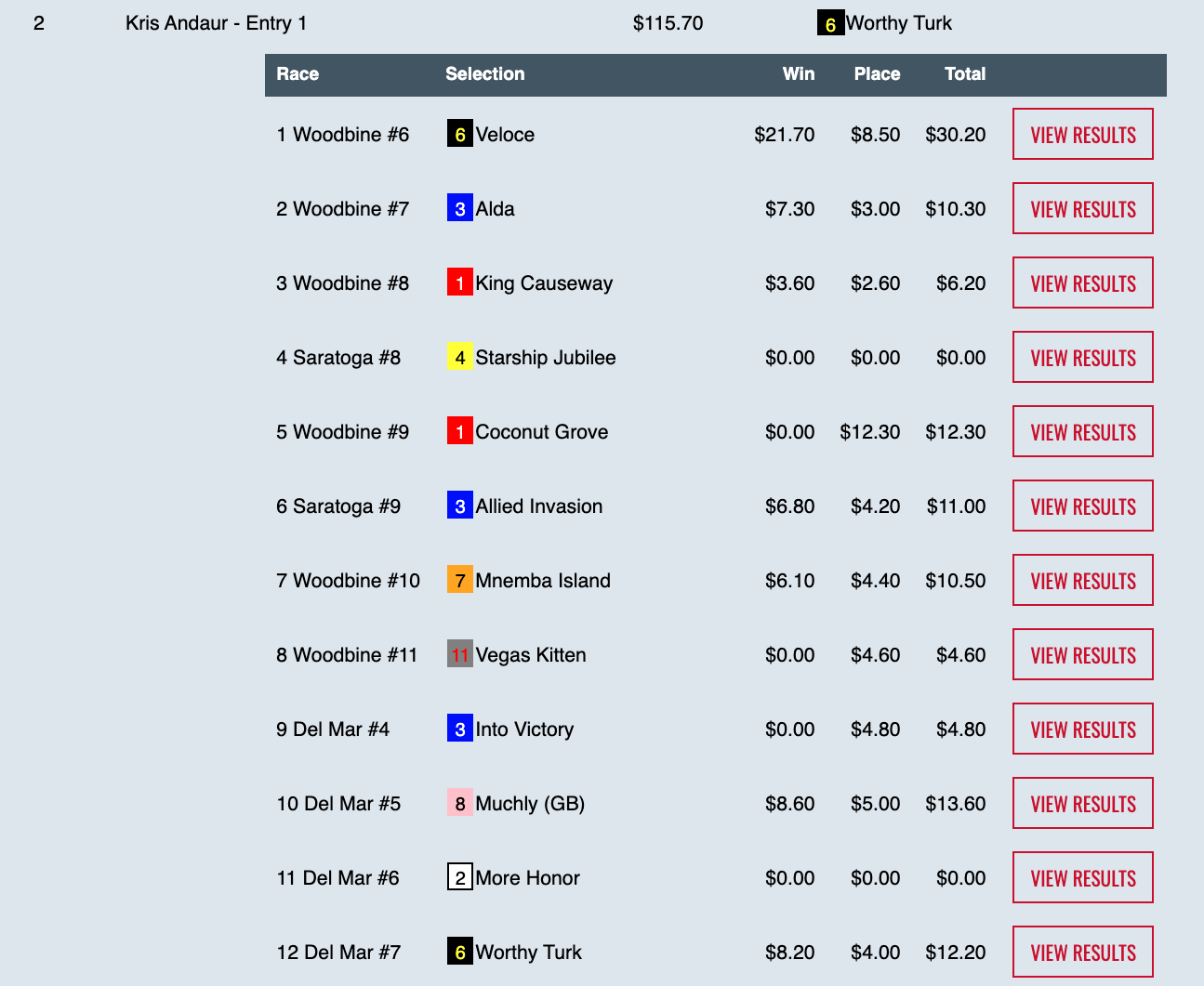 This one proved to be a good buy too. Conway’s picks were slightly different in this one, but he had Red Lark where it counted, and he finished with 3 wins and 3 places to take the grand prize of $12,111 from a total prize pool of $17,301. So it wound up being a $27,000 day for him.