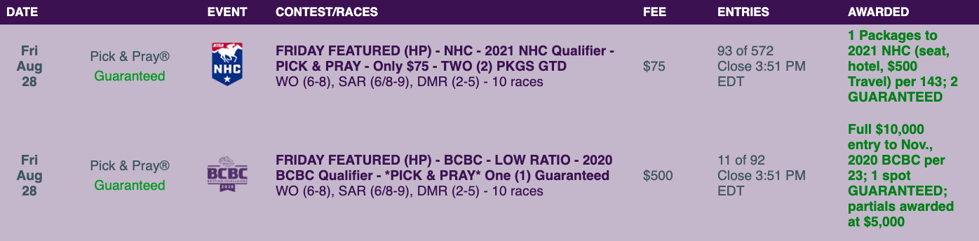 The featured qualifying event at HorseTourneys on Saturday is our Pick & Pray play-in to The BIG One. The grand prize is an entry to The BIG One on September 19-20 plus $500 in cash. (Just nine online seats remain available.) The buy-in here is $395, and entries for this qualifier are capped at 27. In The BIG One, the top 10 finishers get their choice of a seat to the NHC, BCBC or Pegasus World Cup plus they share in a cash pool that is already up to $131,990 (and counting). Finishers 11-15 get a choice of either $1,500 or a Horse Player World Series entry. The BIG One will be held here at HorseTourneys this year, and the final field in September will consist of no more than 57 entries (50 online qualifiers plus up to seven buy-ins). So if you make it to The BIG One, you have a better-than-usual chance to leave with a nice prize.
