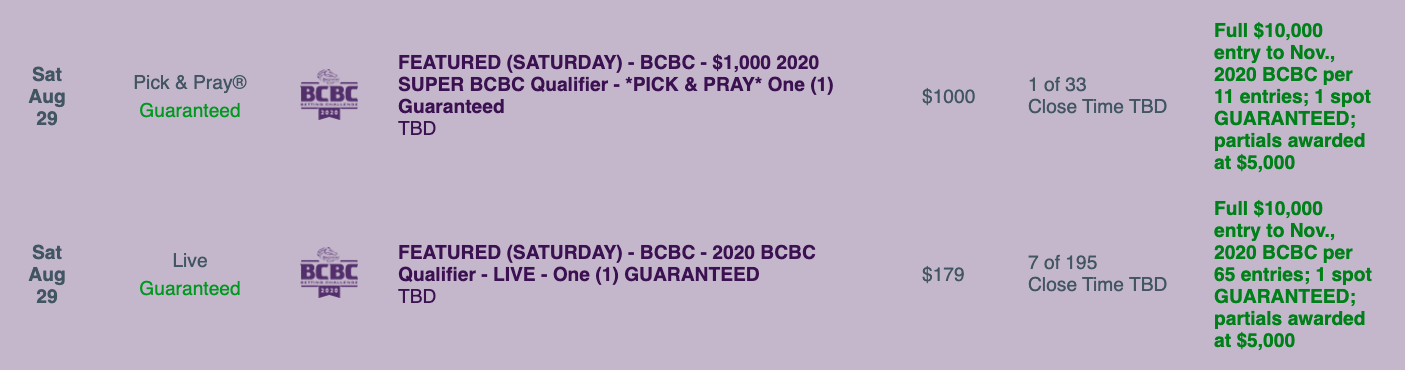 Saturday’s “regular” BCBC play-in has one grand prize guaranteed and carries an entry fee of $179. It’s a live-format tourney with a winning ratio of 1-per-65.