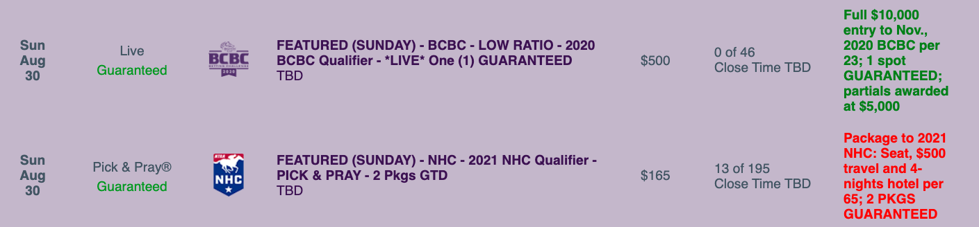 On Sunday at HorsePlayers, a live-format Breeders’ Cup Betting Challenge qualifier and an NHC Pick & Pray comprise the featured-tourney schedule.