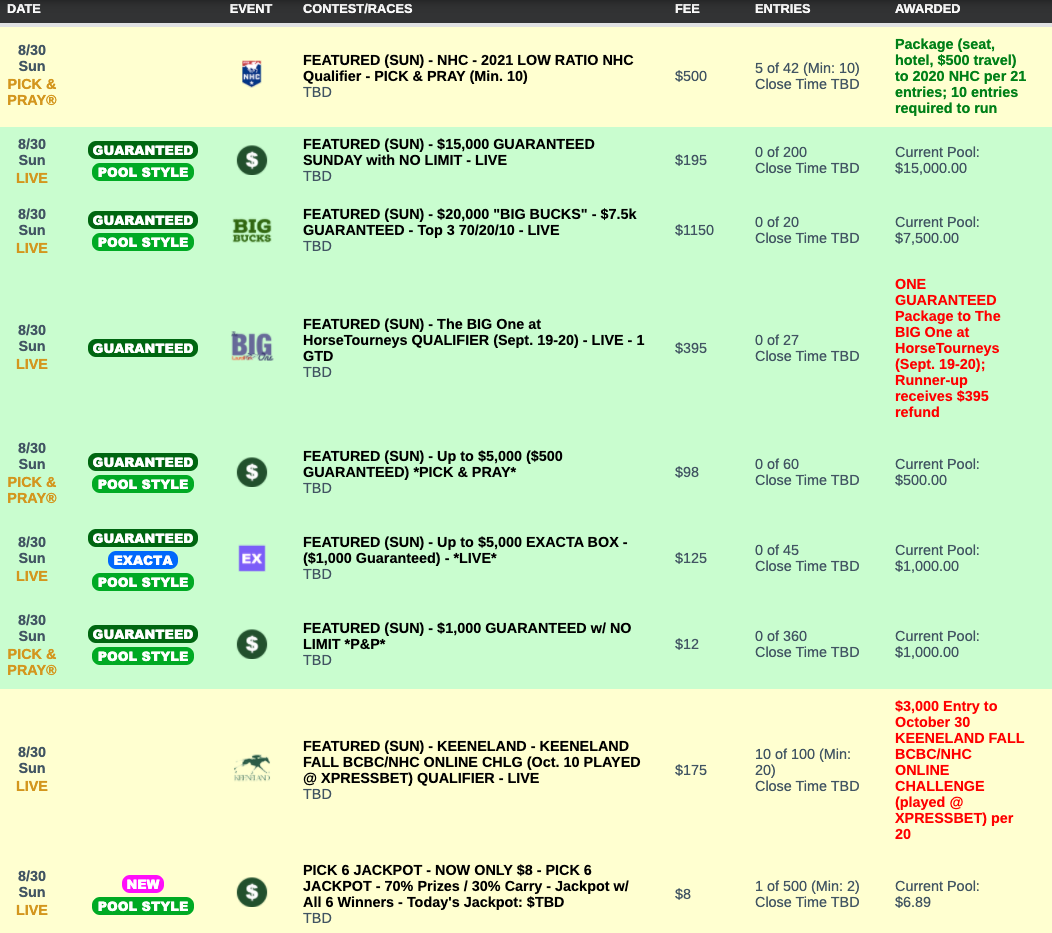 The second of the weekend’s two $8 Pick 6 Jackpot tourneys takes place on Sunday. Check out our Twitter feed on Saturday night or home page on Sunday for an update on what the Jackpot will be. It will be based on how many people take a shot at the Saturday Jackpot (which starts out at $20,429)…and whether anyone hits it. The Pick 6 Jackpot competition is always a live-format game.