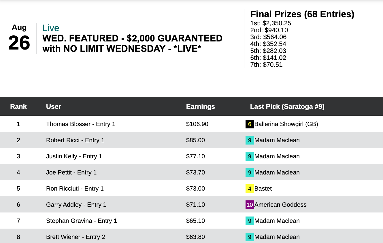The summer is nearing an end but the winning continues at HorseTourneys and HorsePlayers. Last week’s action contained a nice mix of new qualifiers and good, old-fashioned cash, NHC seats and BCBC entries. The featured-tourney fun began on Wednesday.