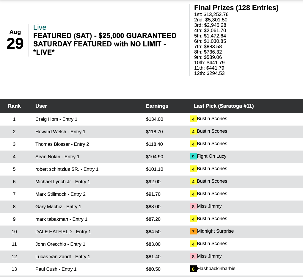 Hang on—we’re being told that, actually, Craig Hom found Soothing (in Del Mar’s 3rd race) and that helped him find the Saturday schedule quite fun. Soothing paid $34.40 to win and $16.60 to place to top Hom’s array of 5 wins and 2 places in our $25,000 Guaranteed cash tourney. Hom thereby earned top money of $13,253 in a game that closed with a pot of $29,252.