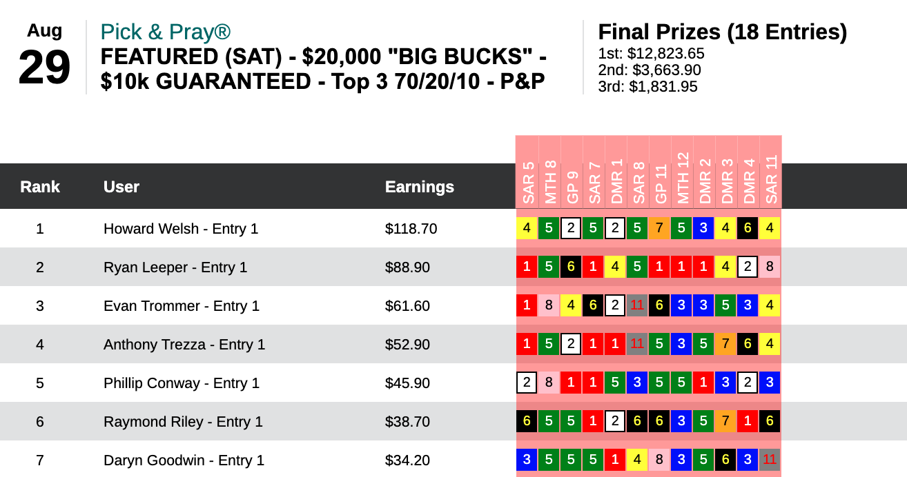 The same selections pictured above made Welsh another $12,823 in Saturday’s $10,000 Guaranteed Big Bucks Pick & Pray. Total Saturday cash earnings for Welsh were $18,624…to go along with the entry to The BIG One.