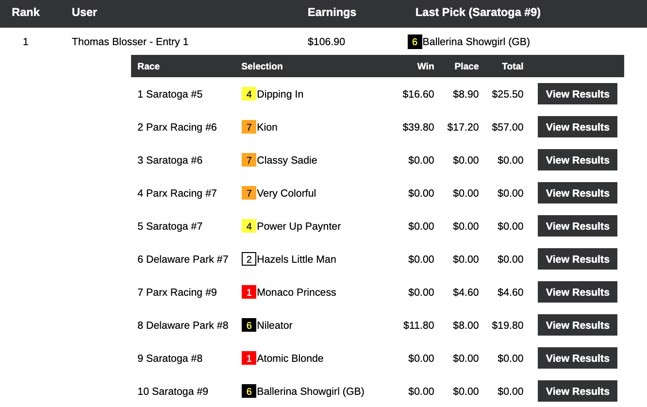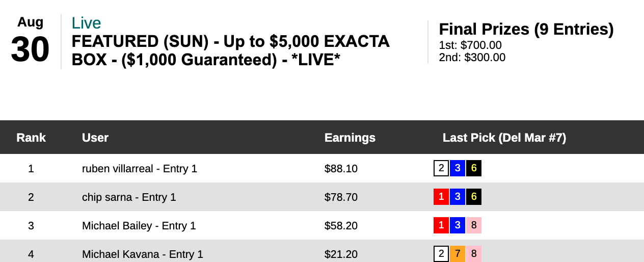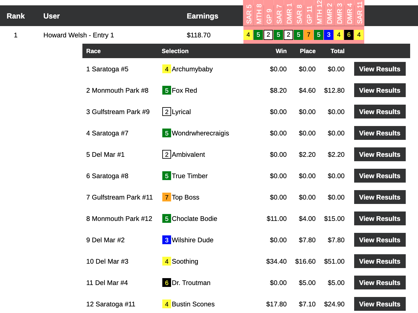 Not a bad return on 12-race scores of $69.70 and $66.00, respectively. Excellent spotting!
