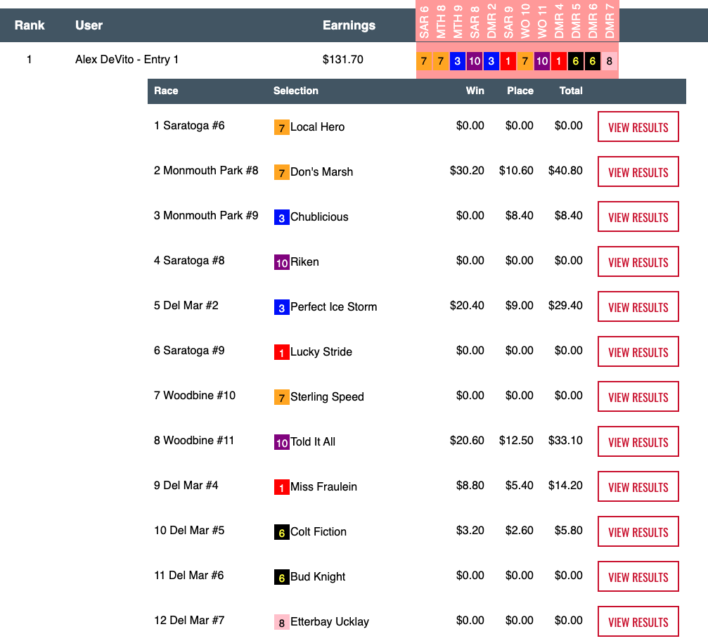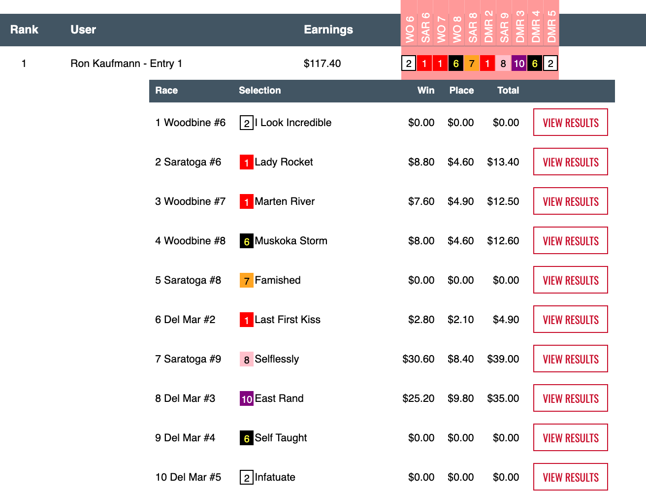 Many of us may have felt stupid on Friday when we let the Chad Brown grass filly Selflessly beat us at 14-1 in the Lake Placid Stakes at Saratoga. David Herberholz was not one of those people. Herberholz had Selflessly as one of his 4 firsts and 3 seconds that, added together, earned him $7,331 in Friday’s $10,000 Guaranteed Pick & Pray, which closed with a final purse of $16,292.