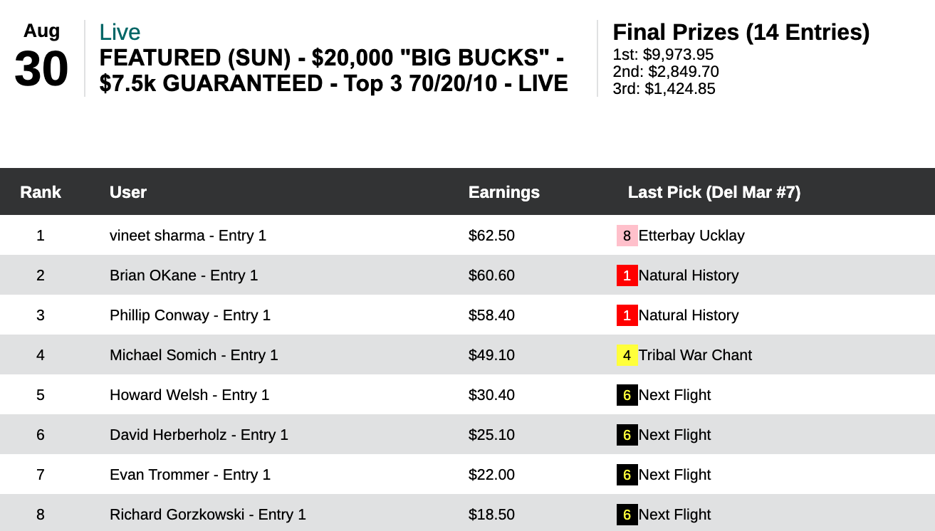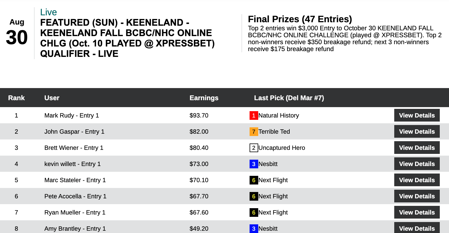 Mark Rudy (4 wins, 2 places) and John Gaspar (2 wins, 2 places) were the recipients of $3,000 Keeneland/Xpressbet entries, and they took two completely different paths to that prize. Rudy has a finish worthy of a museum exhibit thanks to hitting Natural History ($15.50, $5.40) in the 7th at Del Mar. Gaspar had a finish to forget, but he hung on despite whiffing on the final seven tourney races.