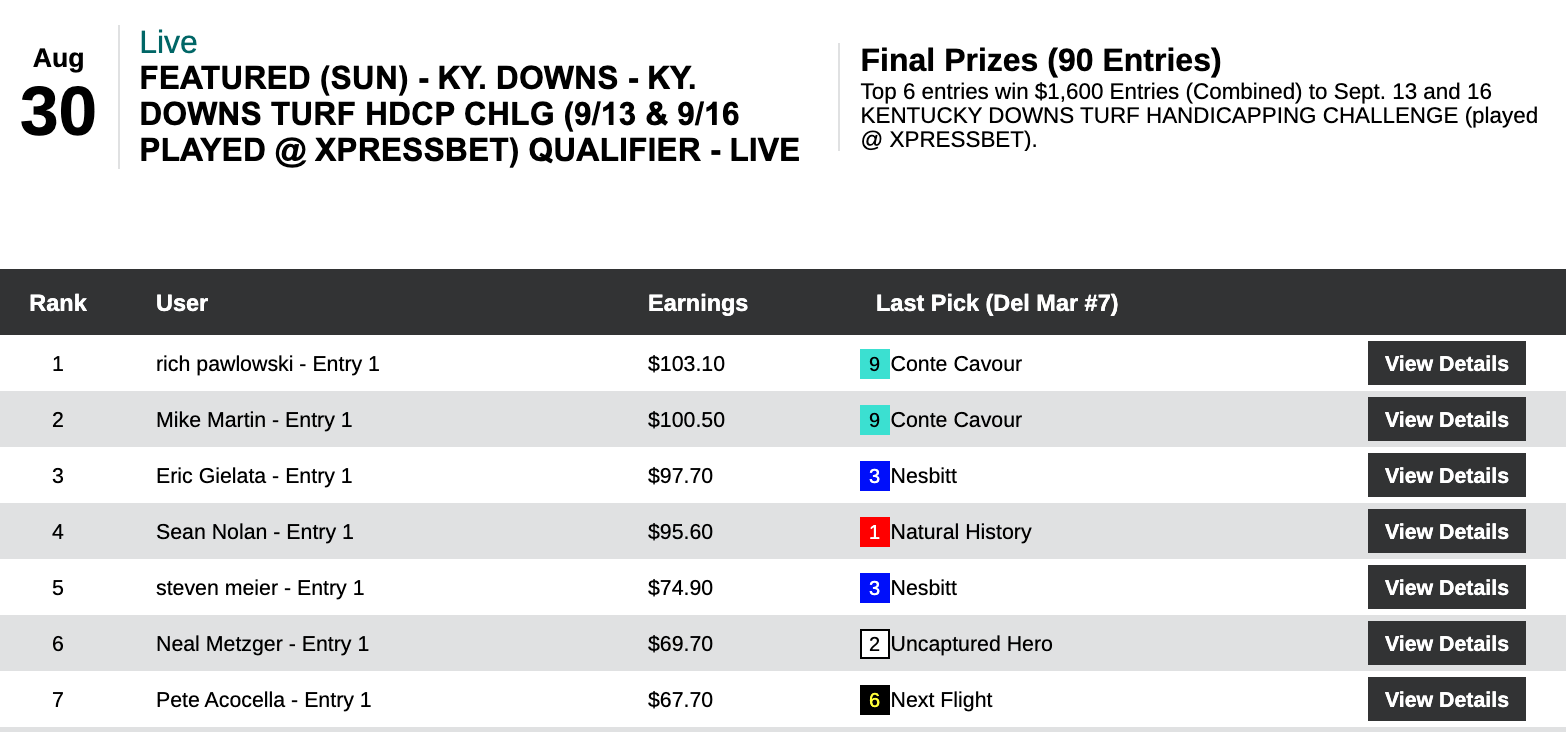 The Kentucky Downs contest (to be held at Xpressbet) is actually two separate competitions—a $1,000 tournament on Sunday and a $600 game on Wednesday. Extra prizes will be awarded for the best combined score over the two days. (Also, it is a grass-only contest and races from Monmouth will also be in the Sunday mix.). Winners of our Sunday qualifier received $1,600 in entry fees, and there were six such winners: Rich Pawlawski, Mike Martin, Eric Gielata, Sean Nolan, Steven Meier and Neal Metzger.