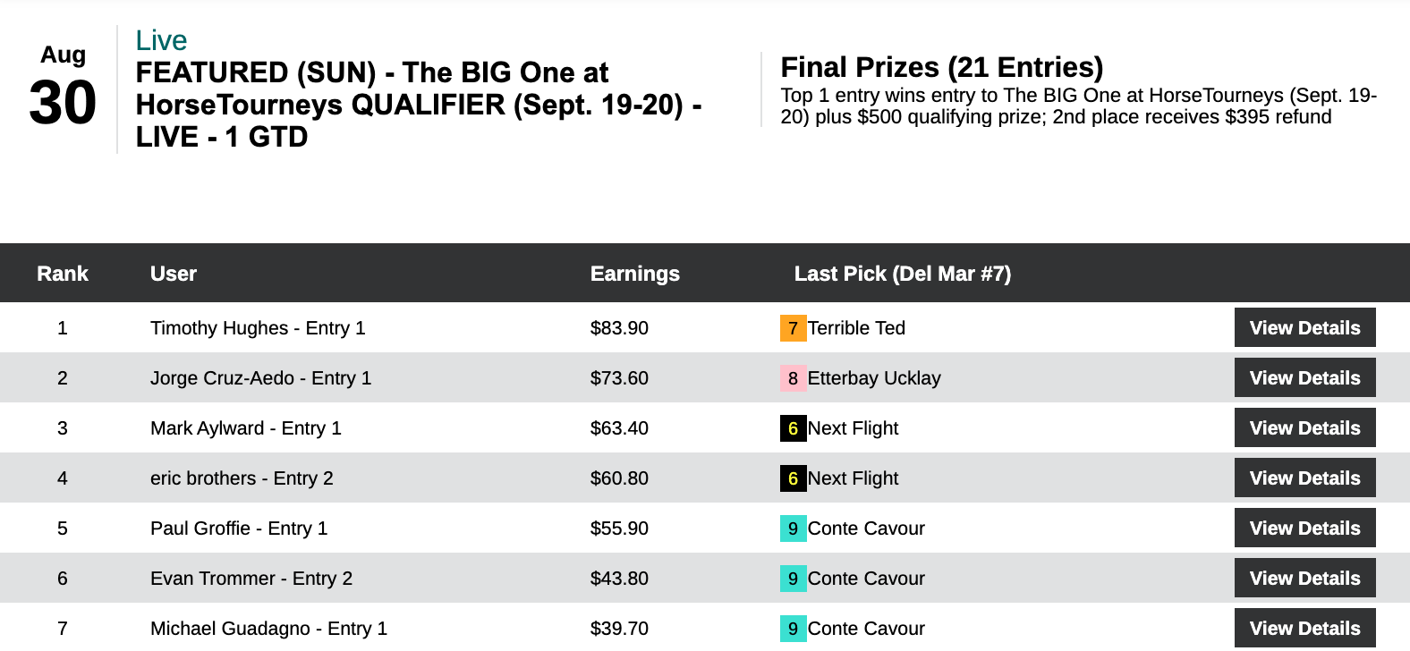 A couple of interesting side notes here: With his Friday NHC-seat win, Aspenleiter is now double-qualified. His first NHC spot was earned all of five days earlier in the August 23 regular ($165) qualifier at HorsePlayers. Aspenleiter probably wishes that the NHC were next week!